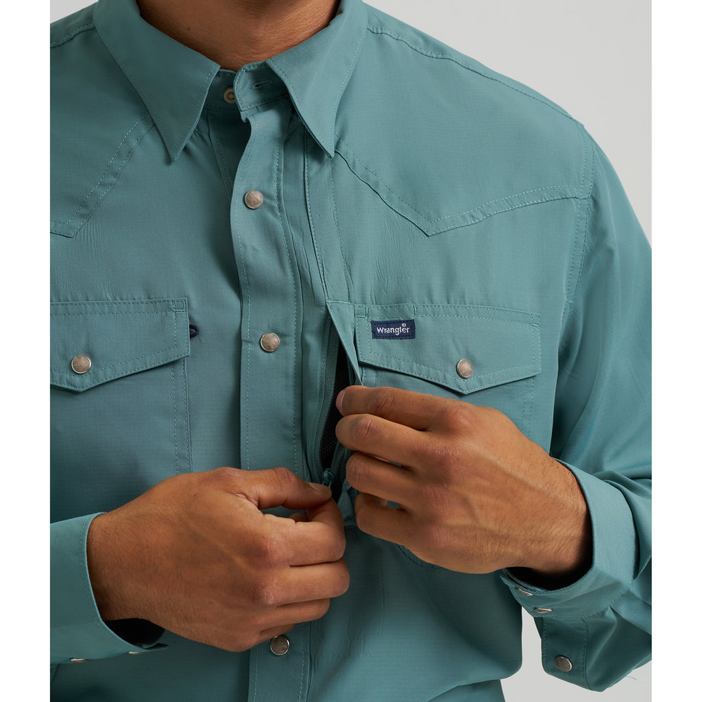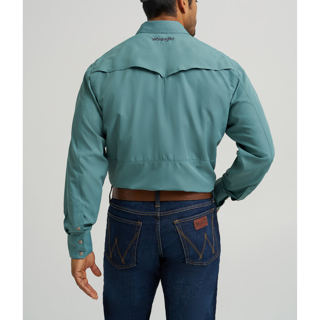 Get ready to tackle your day in the Wrangler® performance long-sleeve snap shirt, designed to keep you cool and protected with UV defense and moisture-wicking magic. This classic fit gem offers unbeatable comfort and airflow thanks to a handy back vent.