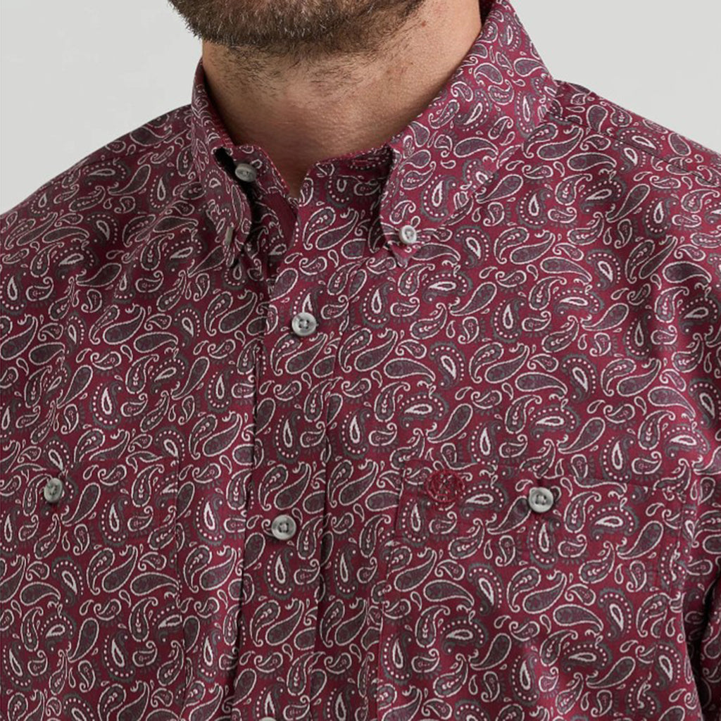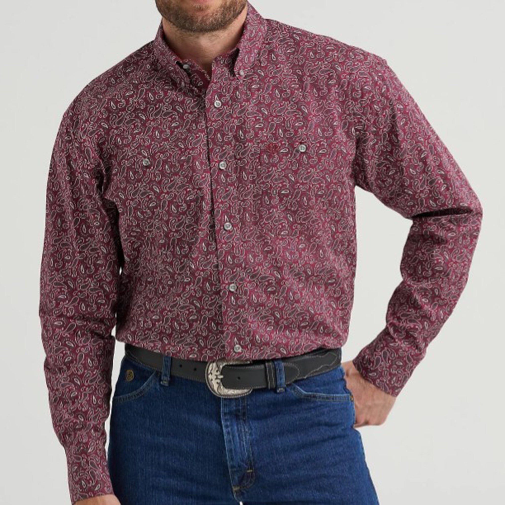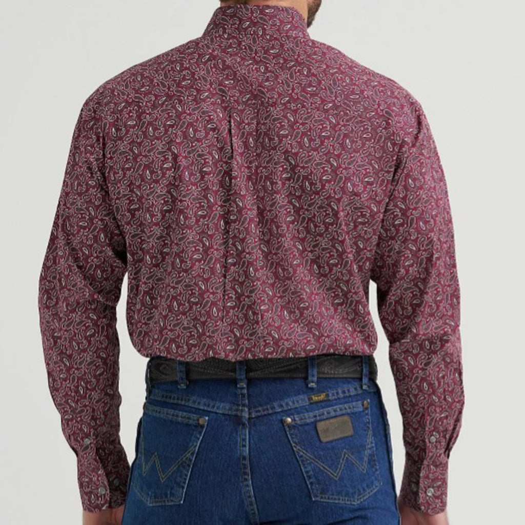 Saddle up in timeless Western style with this Wrangler George Strait signature pearl snap shirt. The striking red and grey paisley pattern delivers authentic cowboy charm with modern appeal, perfect for rodeos, ranch work, or nights out on the town.