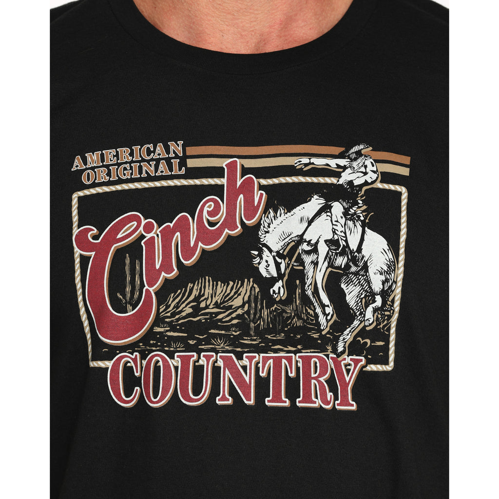 Show off your cowboy spirit with the Cinch Men’s Country Bronc Black T-Shirt. Featuring a lively bucking horse graphic across the chest, this short-sleeve crewneck tee blends rugged style with everyday comfort. Made from soft cotton fabric, it offers a relaxed fit that’s ideal for warm-weather wear or layering under a jacket.