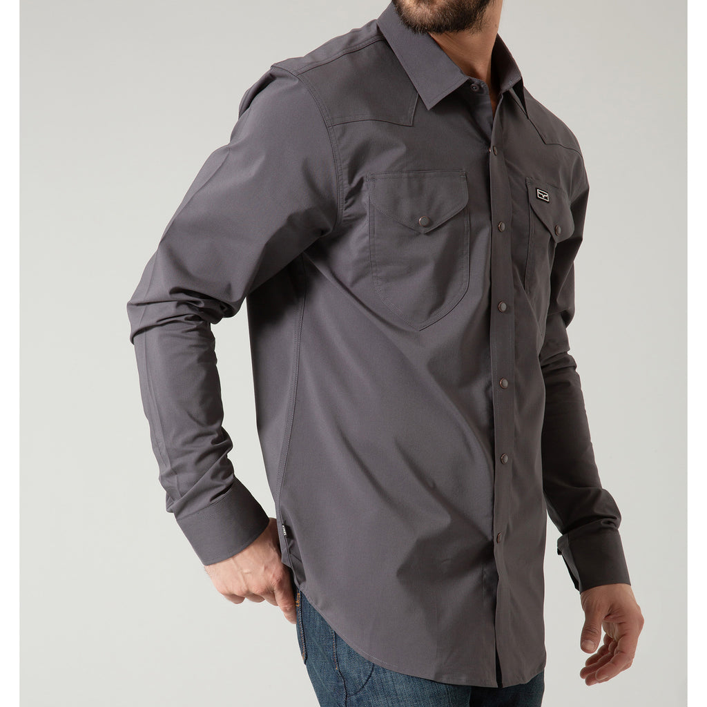 The Blackout features stretch-woven, moisture wicking Coolmax fabric. This piece is solid-colored and full of classic western details like matching pearl snap buttons down the front and closing the two chest pockets, a western yoke, and a collared neckline. The Blackout is the ultimate western work shirt.