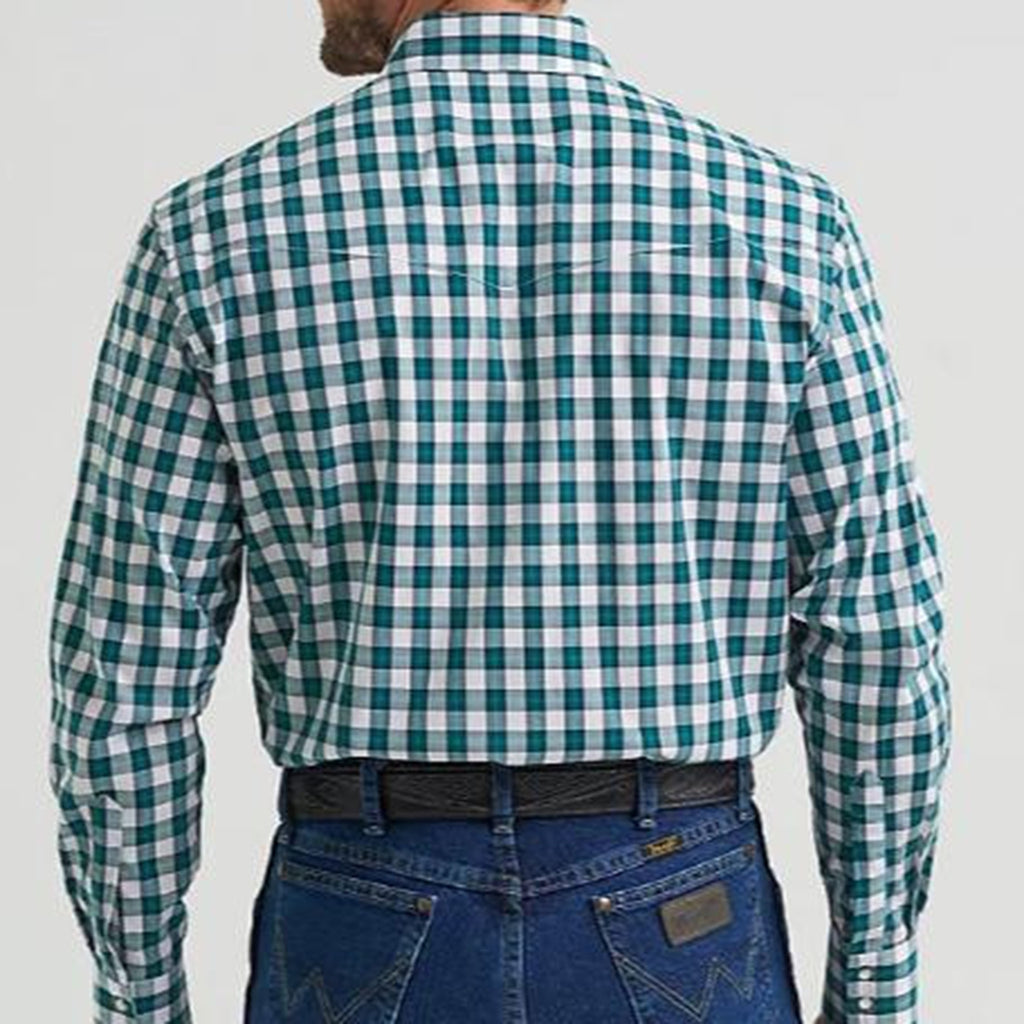 Classic Western style meets modern comfort in this Wrangler green plaid pearl snap shirt. The timeless plaid pattern pairs perfectly with pearl snaps for that authentic cowboy aesthetic, while the quality construction ensures durability through ranch work or casual wear.