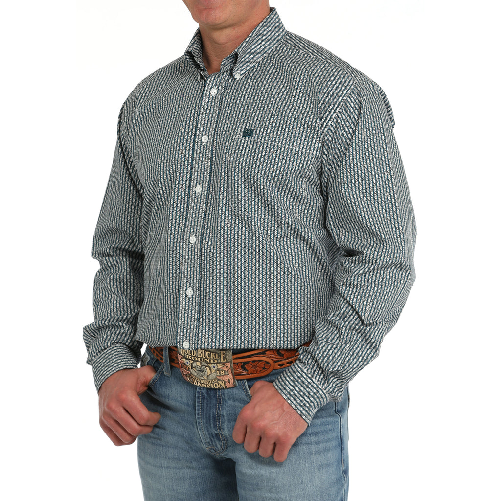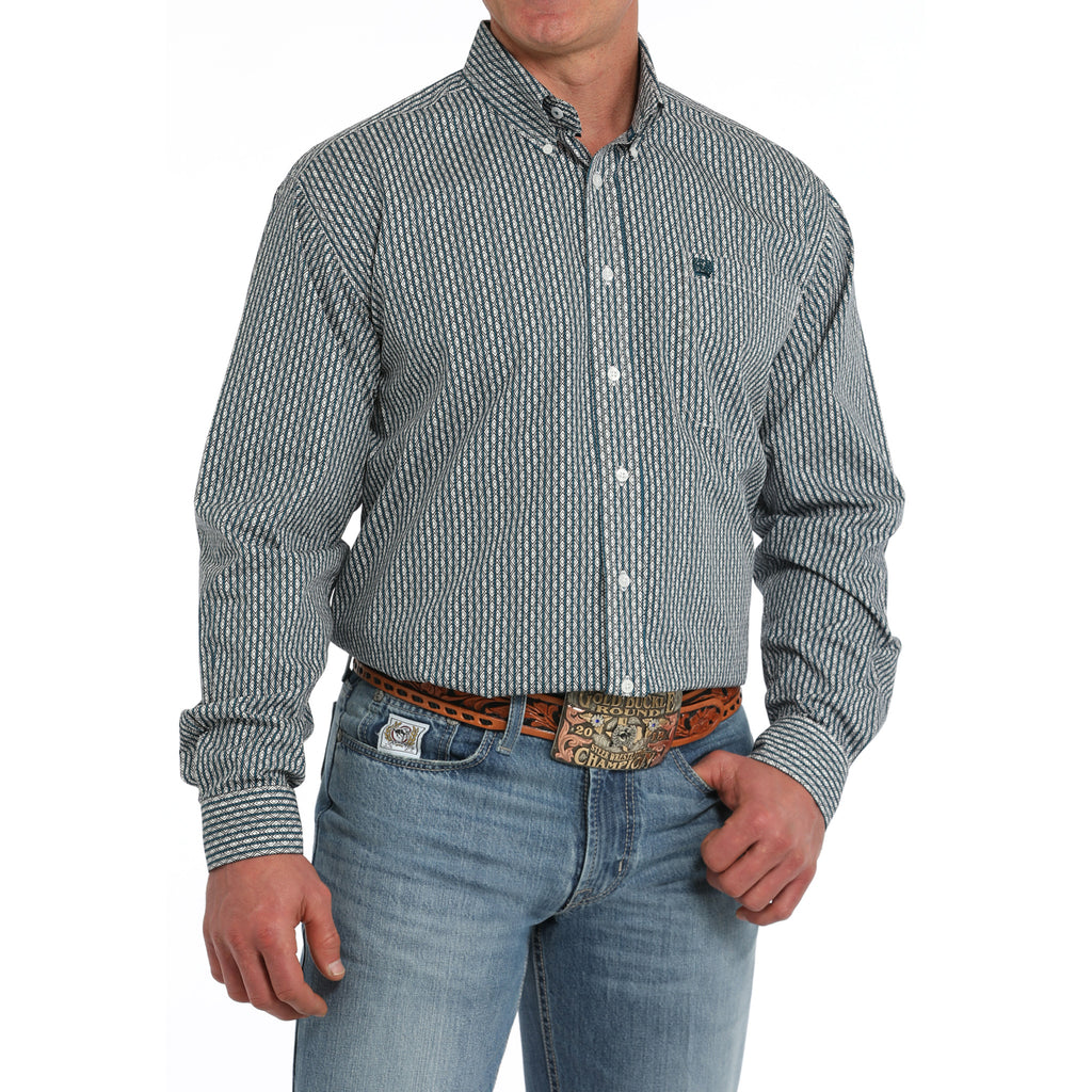 Take on any adventure with the bold and daring Cinch men's geometric stripe shirt! Featuring a green and white geo stripe design, this button-down long sleeve shirt is perfect for the risk-taker in you. Made for comfort and style, it's the perfect addition to your wardrobe.