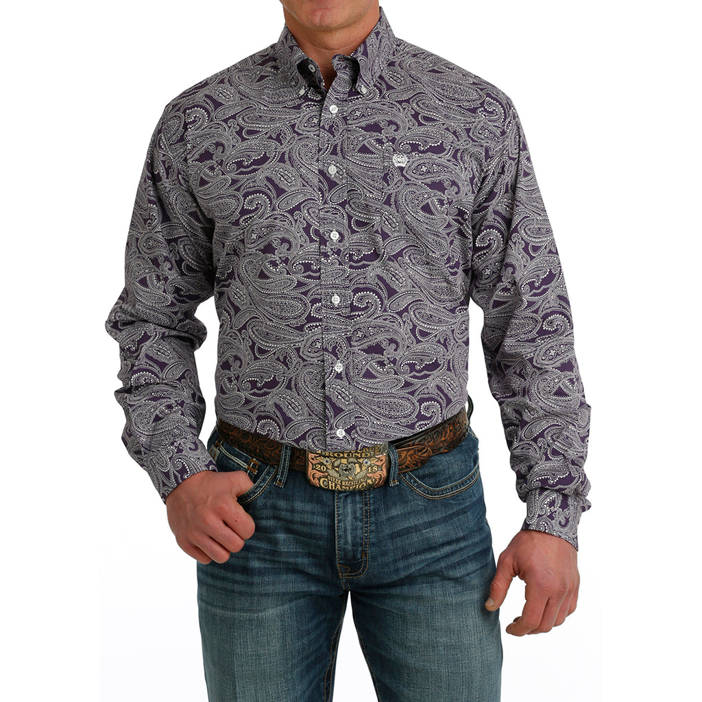 This timeless purple button-down shirt offers a classic paisley print, an open left front pocket, and embroidered Cinch logo. Complete with white buttons, it pairs effortlessly with new blue jeans and boots for a reliable and stylish look.