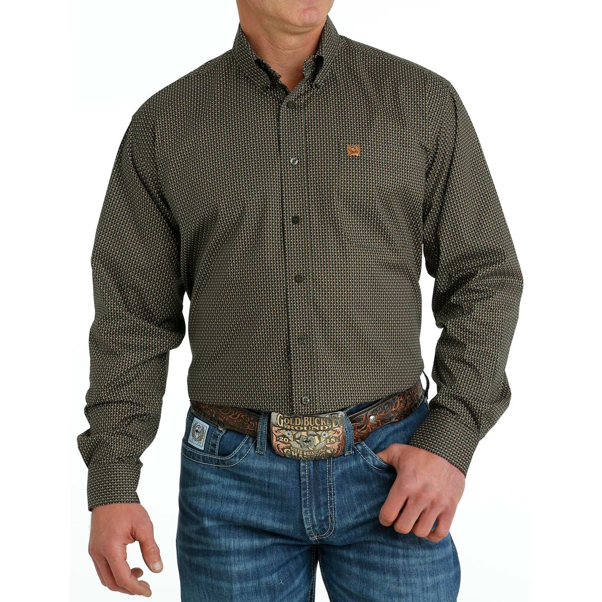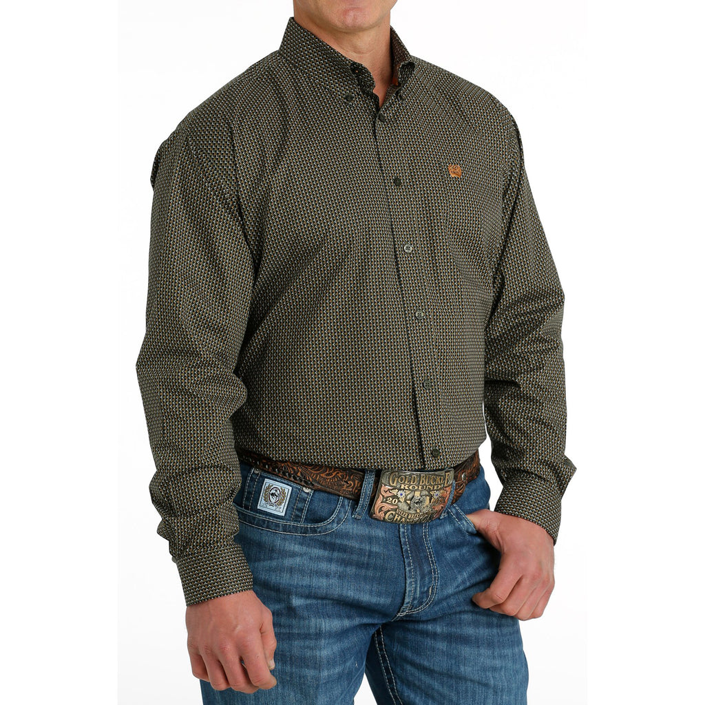 Designed in a modern olive geometric print, this comfortable cotton-spandex plain weave by Cinch is your next wardrobe front-runner. Featuring an open left front pocket with embroidered logo and olive buttons, this shirt upgrades any denim in the stack.