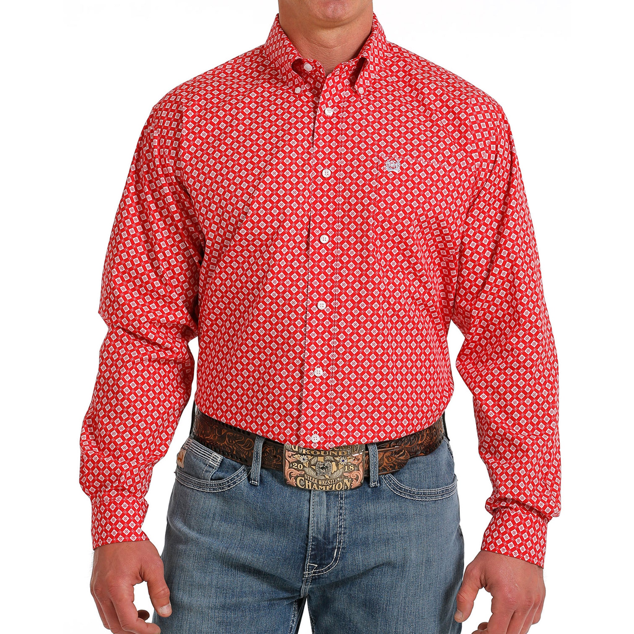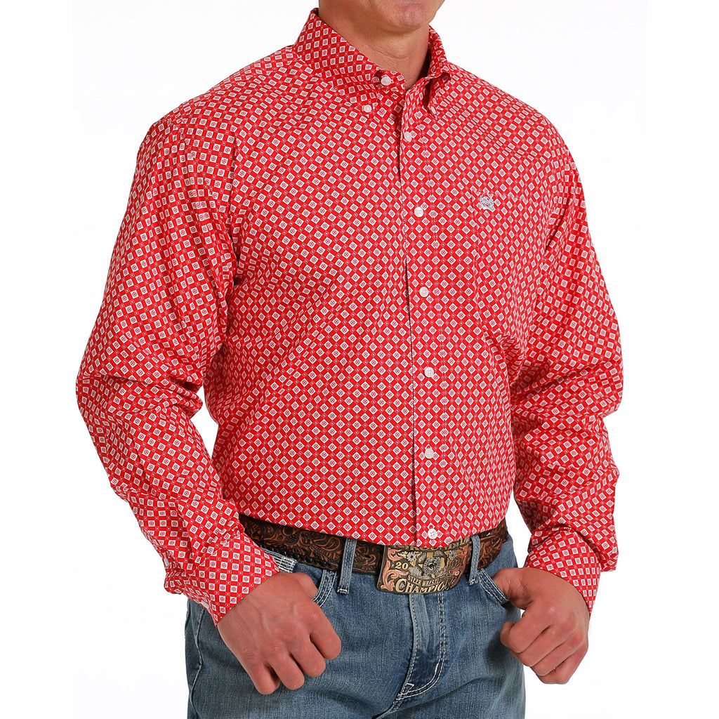 Whether worn on workdays or to special events, this bold red geometric printed cotton plain weave by Cinch is certain to upgrade any blue jeans or khakis in your closet. Design details include an open left front pocket, embroidered logo and white buttons.