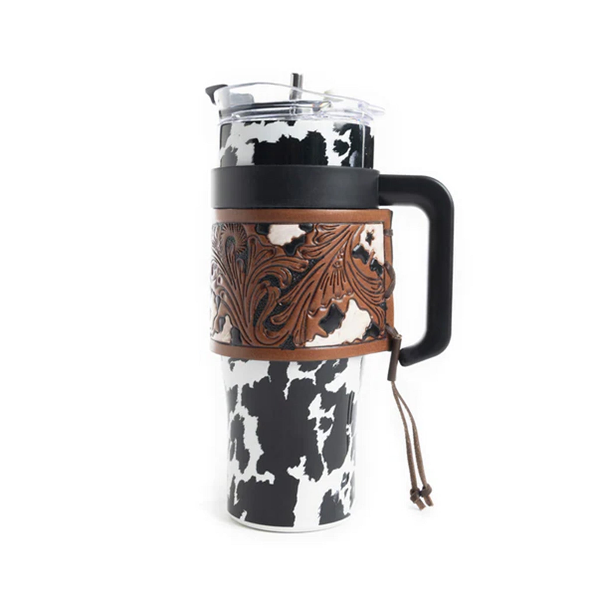 Crafted with genuine leather featuring classic cowprint detailing, it's the perfect blend of Western charm and everyday practicality. Whether you're sipping your morning coffee or keeping drinks cold on the trail, this durable tumbler keeps your beverages at the right temperature while turning heads. A must-have accessory for anyone who loves bold, distinctive design with an authentic cowboy spirit.
