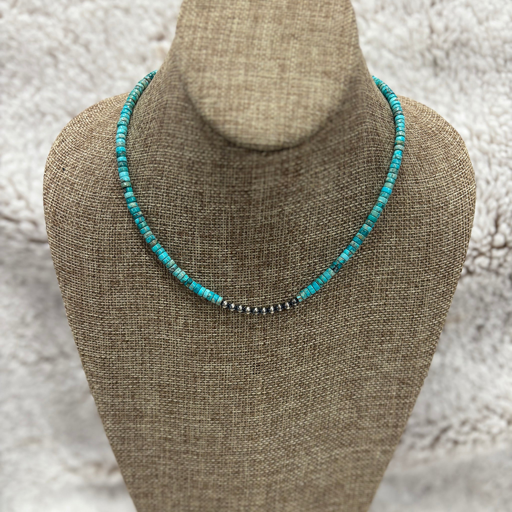 Elevate your collection with this refined beaded necklace, showcasing the distinctive blue-green hues of authentic Kingman turquoise paired with lustrous Navajo pearls. Each bead is thoughtfully arranged to create a harmonious blend of natural beauty and artisanal craftsmanship. The interplay between the vibrant turquoise and the warm metallic pearls produces a sophisticated aesthetic that complements both casual and formal occasions. A timeless piece that honors traditional southwestern jewelry-making techniques while delivering contemporary elegance.