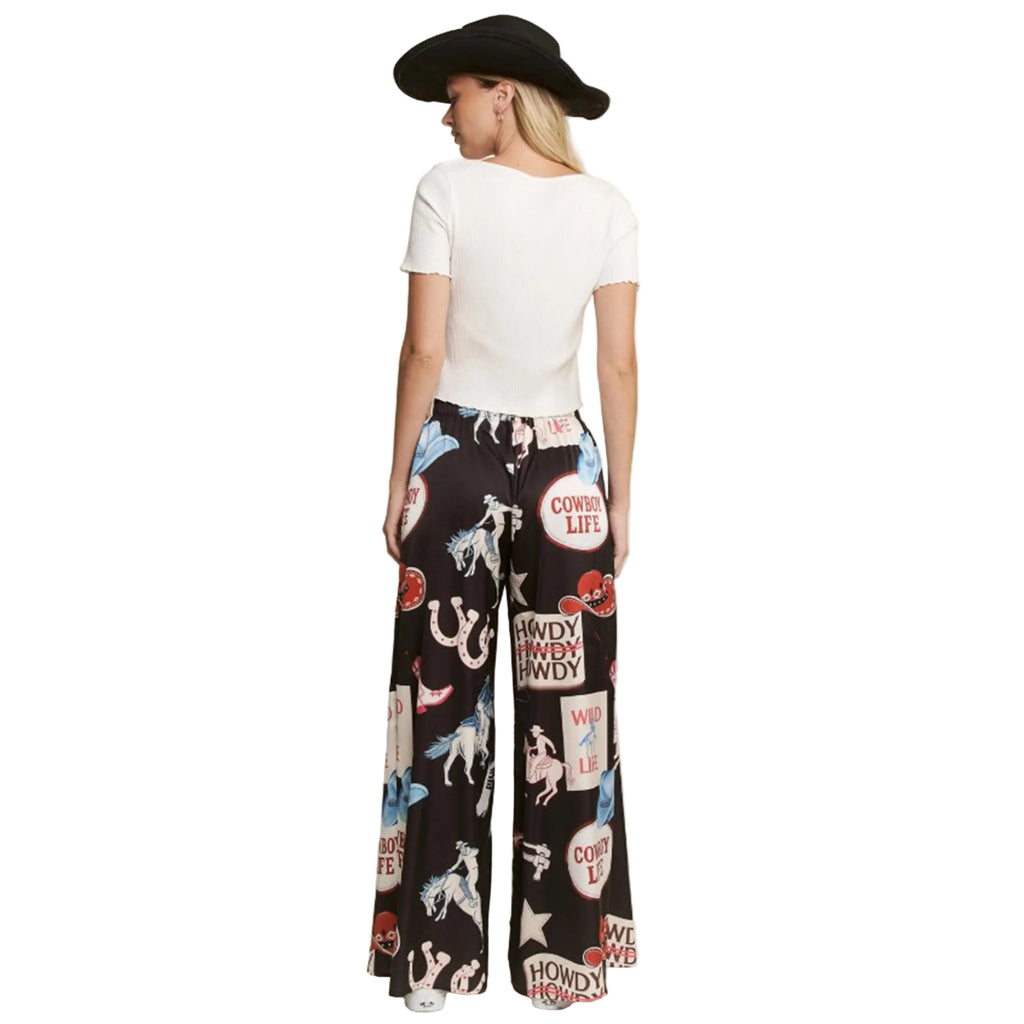 Make a bold statement with these Black Cowboy Party Pants. Featuring an eye-catching satin finish and striking cowboy graphic design, these pants command attention at any gathering. The sleek black satin fabric drapes beautifully while the graphic detailing adds an edgy, rebellious flair. Perfect for those ready to stand out and own the room with confidence and style.