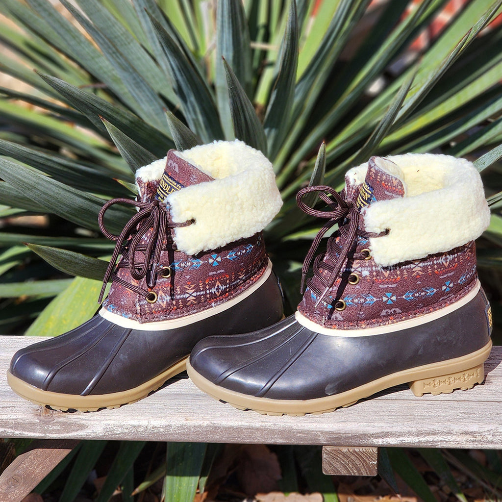 These Pendleton duck boots are waterproof and quality constructed of premium rubber with waxed cotton uppers featuring a beautiful Aztec pattern. No-slip soles in their exclusive Mountain Majesty tread provide traction in wet or dry conditions. Cushioned insoles and internal shank system provide all-day comfort and support; pull-tab allows for easy on-and-off. Plus, they have Moisture-wicking linings.