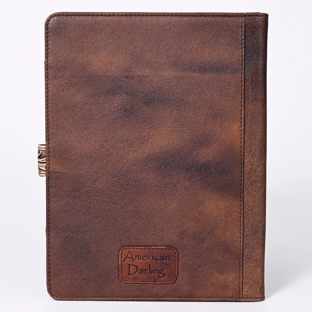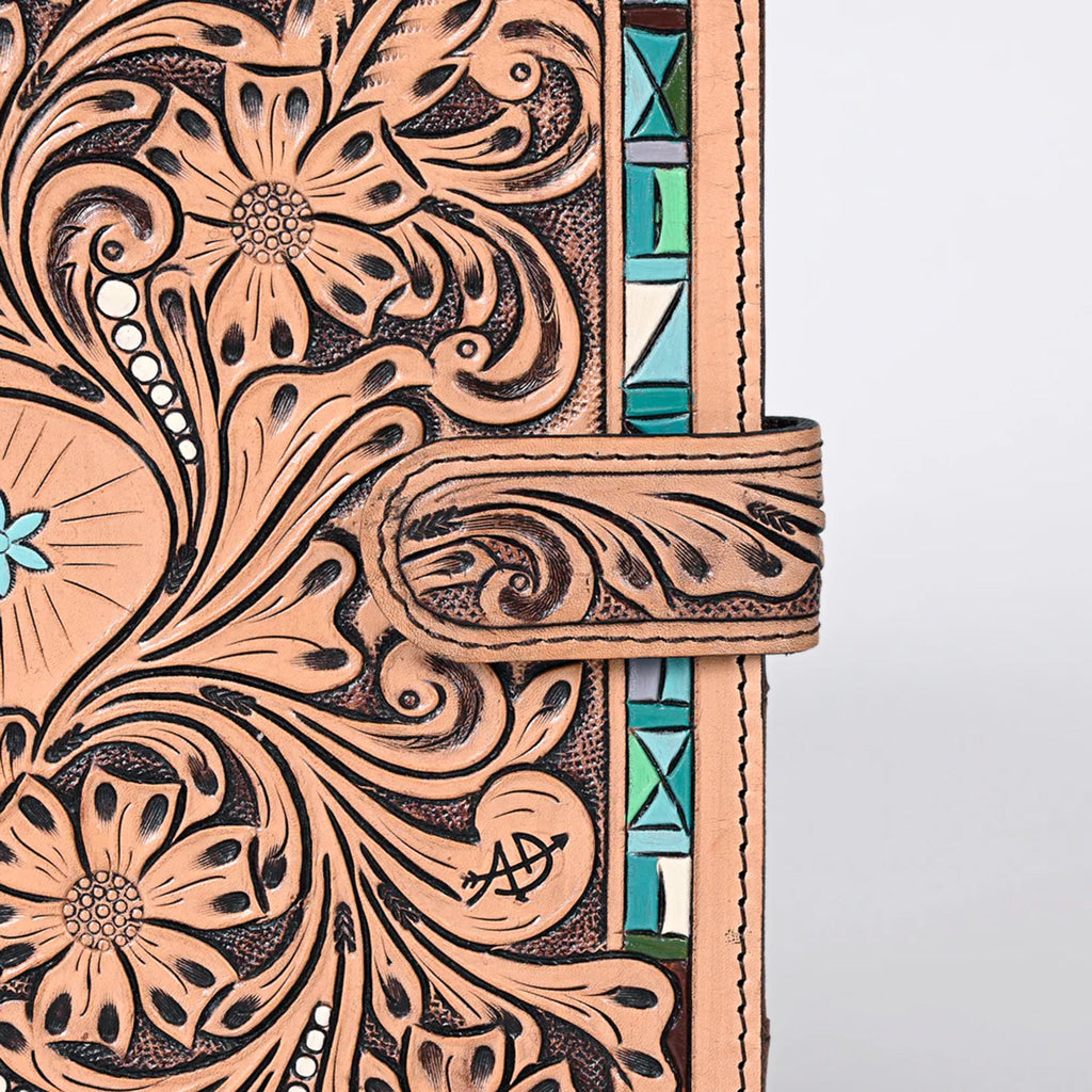 Elevate your style with the American Darling Tooled Turquoise Portfolio, a refined accessory that blends intricate craftsmanship with vibrant turquoise accents. Expertly tooled leather offers a timeless, sophisticated look, while the spacious interior keeps your essentials organized and accessible. Perfect for those who appreciate artistry and functionality in one elegant package.