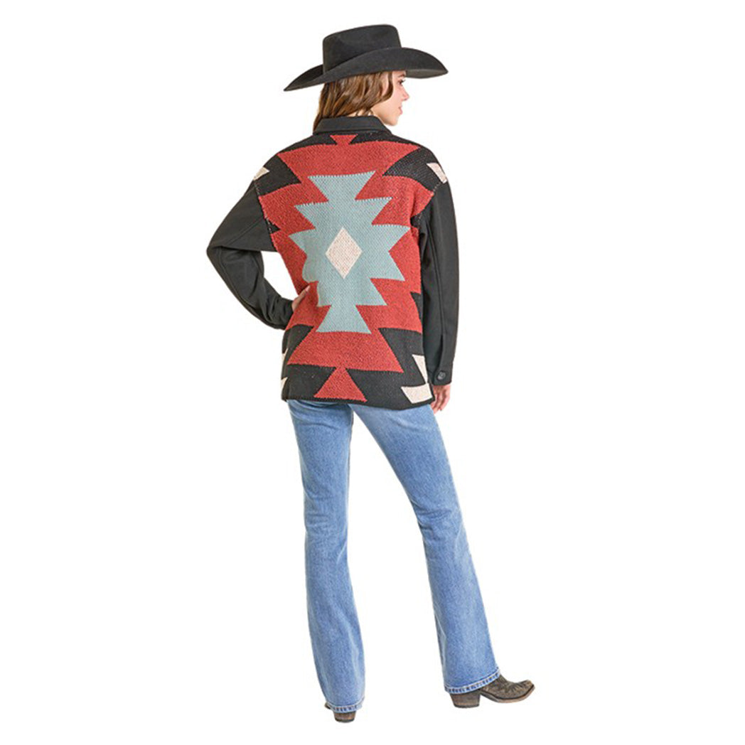 Featuring bold Aztec-inspired knit back pattern against a sleek black front, this piece brings edgy flair to any outfit. Whether you're throwing it over a tee for weekend vibes or pairing it with a dress for an unexpected twist, this shacket delivers comfort without compromising on attitude. Versatile, eye-catching, and undeniably cool.