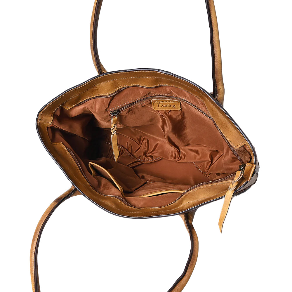 This tote features hand-selected cowhide hair-on leather paired with the trendy boot stich top design, that feels soft to the touch while giving it that perfect western flair. The trusty YKK zipper keeps your valuables safe and sound, while the intricate genuine leather braiding adds a charming, detailed finish you’ll love showing off.