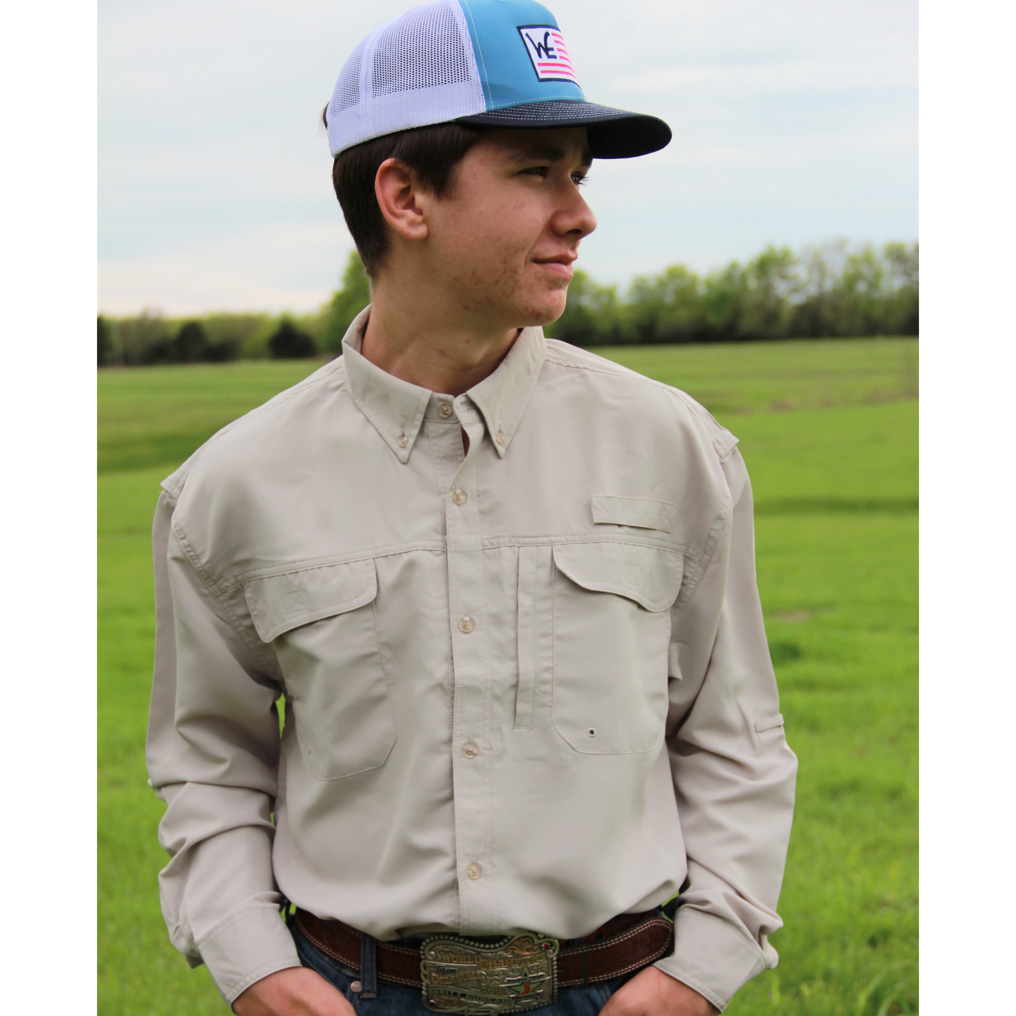 This Stone colored fishing shirt, from Stillwater Supply Co. is the perfect summer shirt! From keeping you cool at the lake fishing to the roping pen and everywhere in between. It has a meshed lining with vent in the back for that cool breeze to come through. Plus, this shirt offers 40+ UPF Protection.