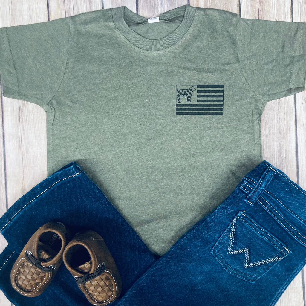 Here's the perfect tee for your little cowboy that loves cattle and is proud to be American! This tee features an American flag on the front left chest, with the stars section being a cow made of stars. On the back, the top reads American, with that same flag below it, and the words under saying, "Bred, Raised, and Fed."