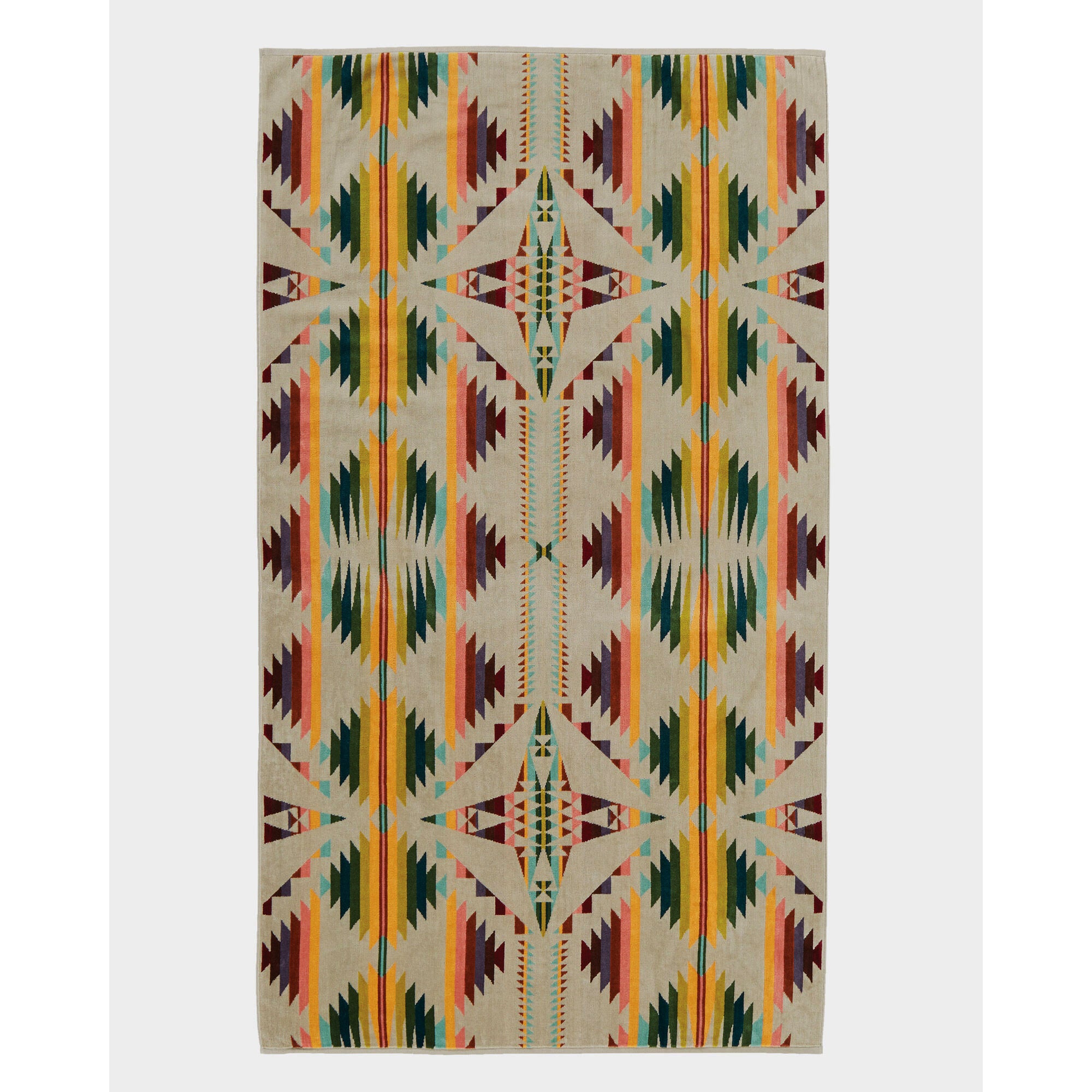 This Pendleton Wool Spa towel is sure to tie a bathroom together. The supersized towel is woven of cotton velour in vivid colors that stay true, wash after wash. Sheared on one side for softness, looped on the other for superior absorption. A luxury you'll love for the beach, hot tub or pool.