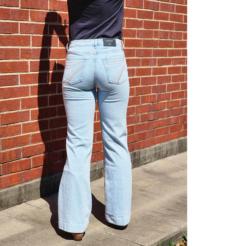 - Iconic 7 back pocket embroidery in pink stitching on the back pockets