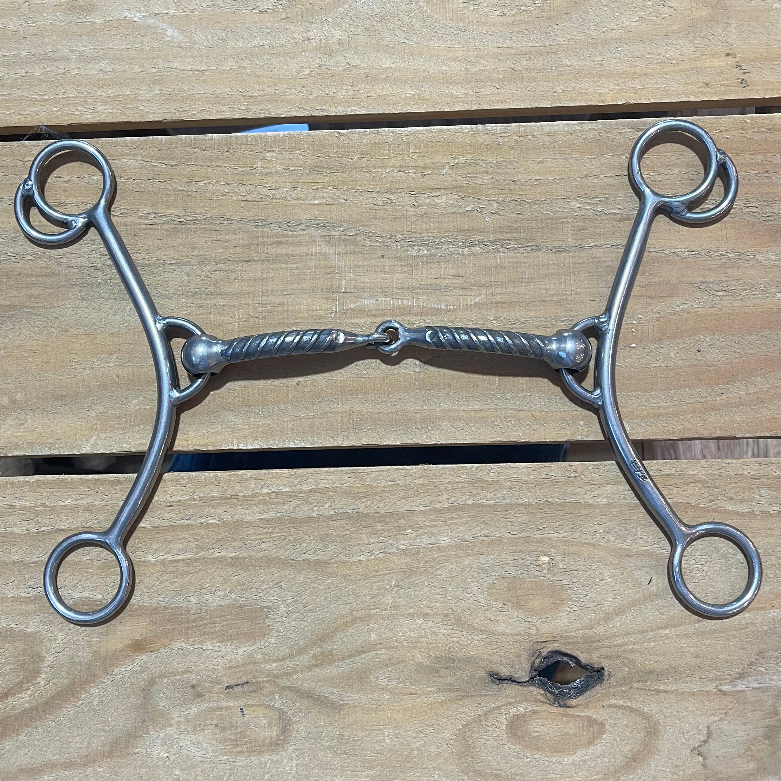 The Big Betty is Handmade by Troy Flaharty, it offers a great feel and weight. This bit is designed very similar to the regular Betty, just with a longer shank and back set curb. This particular bit features a rebar snaffle.