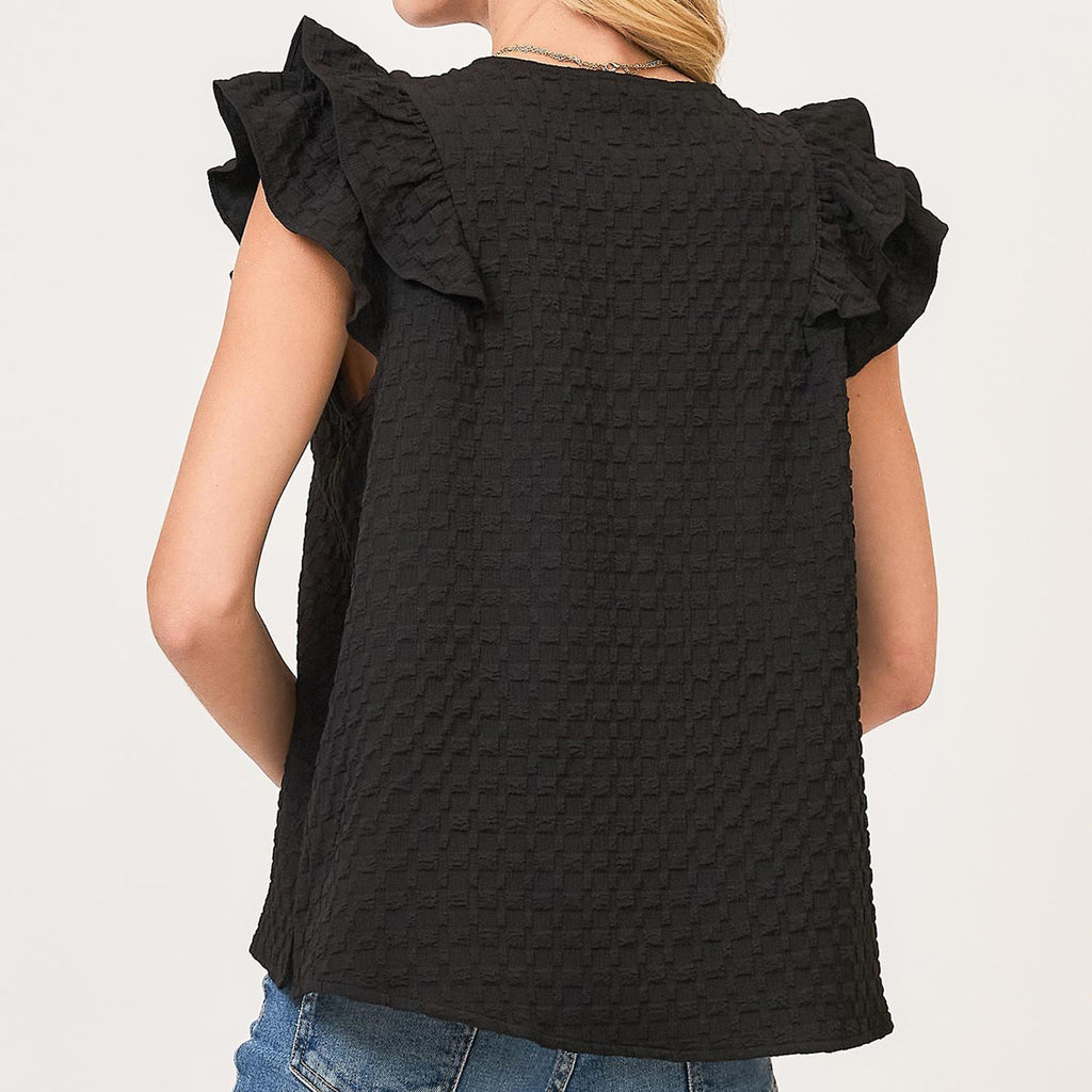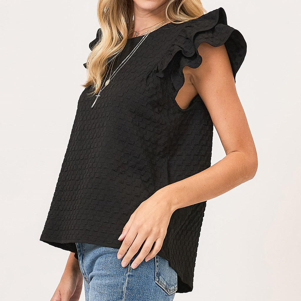 Stay effortlessly stylish with our Black Waffle Textured Short Ruffled Sleeve Shirt. The unique texture adds a fun twist to your everyday look, while the ruffled sleeves bring a playful touch. Perfect for any occasion, this shirt is sure to become a favorite in your wardrobe.