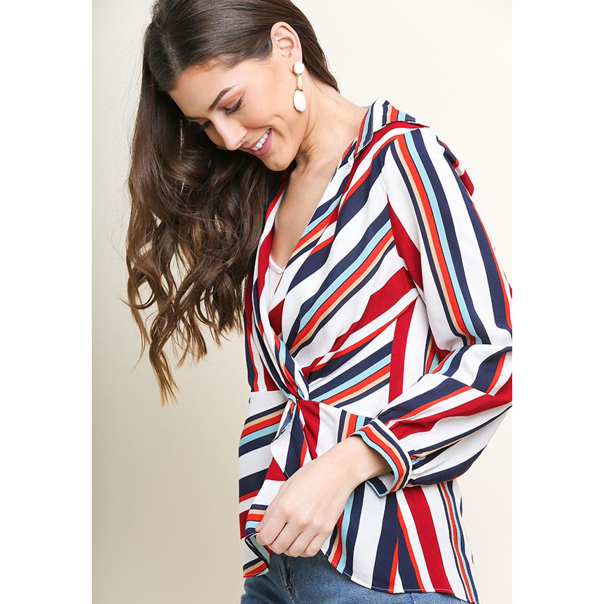 This lightweight long sleeve top shows off colors of white, red, navy, and orange in a fun striped pattern. With a deep v cut neckline and front gathered knot, you'll be showing off just the right amount of sassiness in style!