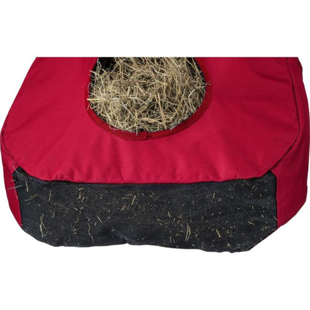 Experience the durability of the best-selling hay bag, constructed from strong "teeth-resistant" nylon. With an 8" round hole in the front for effortless snacking and a wide mesh bottom that sifts out dust without compromising hay, feeding time will be stress-free. Additionally, the reinforced nylon clip strap provides a secure fit in your horse's stall.