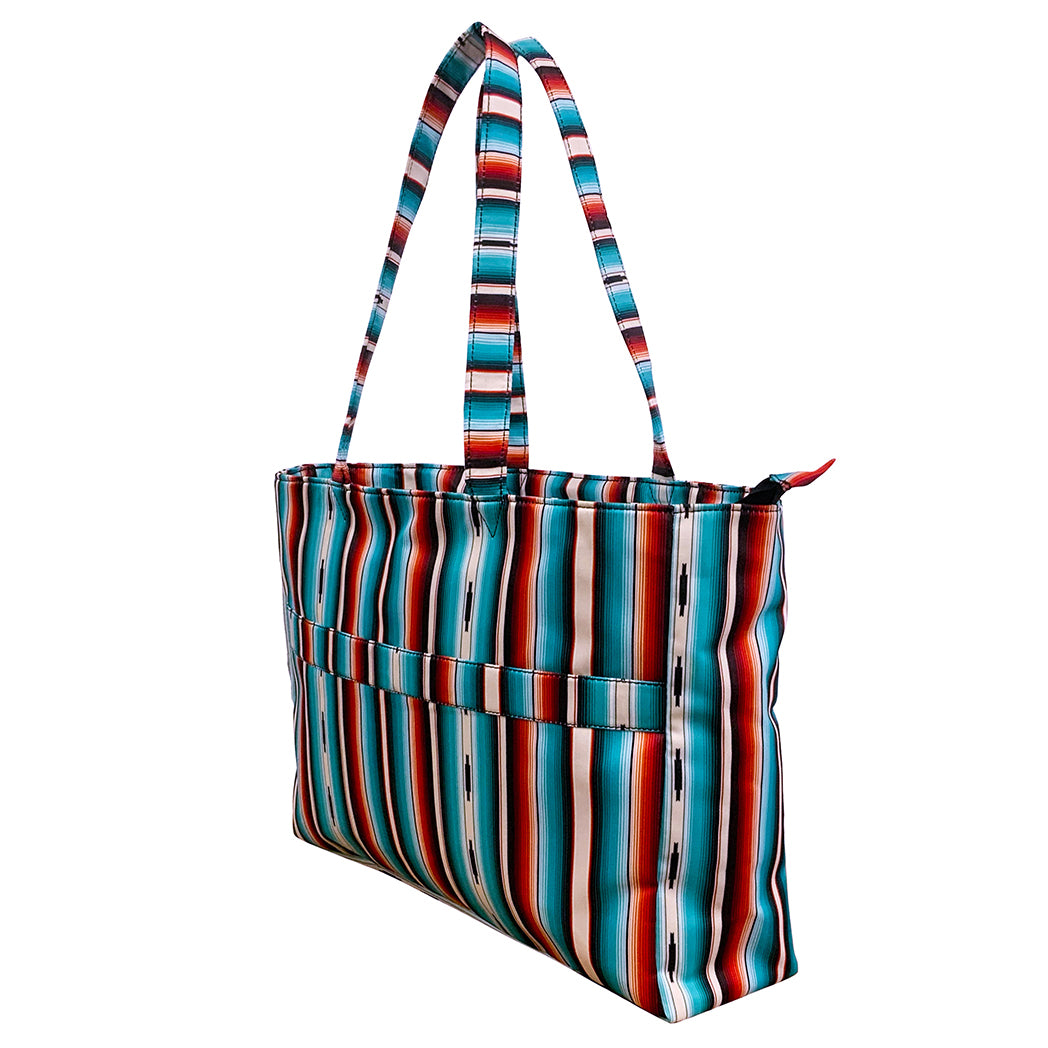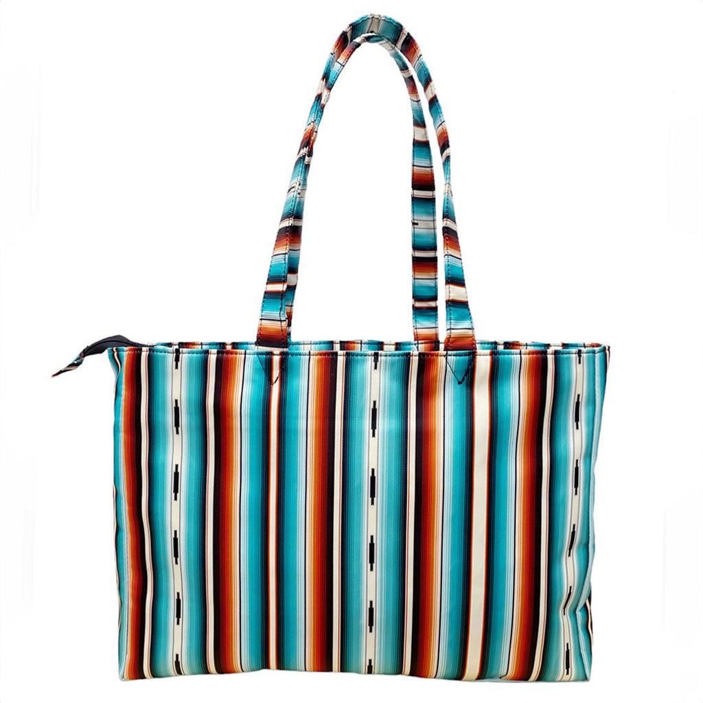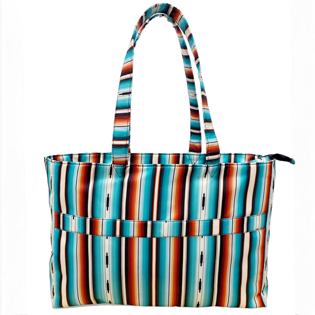 The Showman Teal Serape Nylon Travel Tote's functional ability has you covered. Crafted from durable nylon material in a vibrant teal serape pattern, this tote is as eye-catching as it is practical. Its lightweight construction makes it easy to carry, while the sturdy design ensures it can handle all your equestrian essentials with ease.