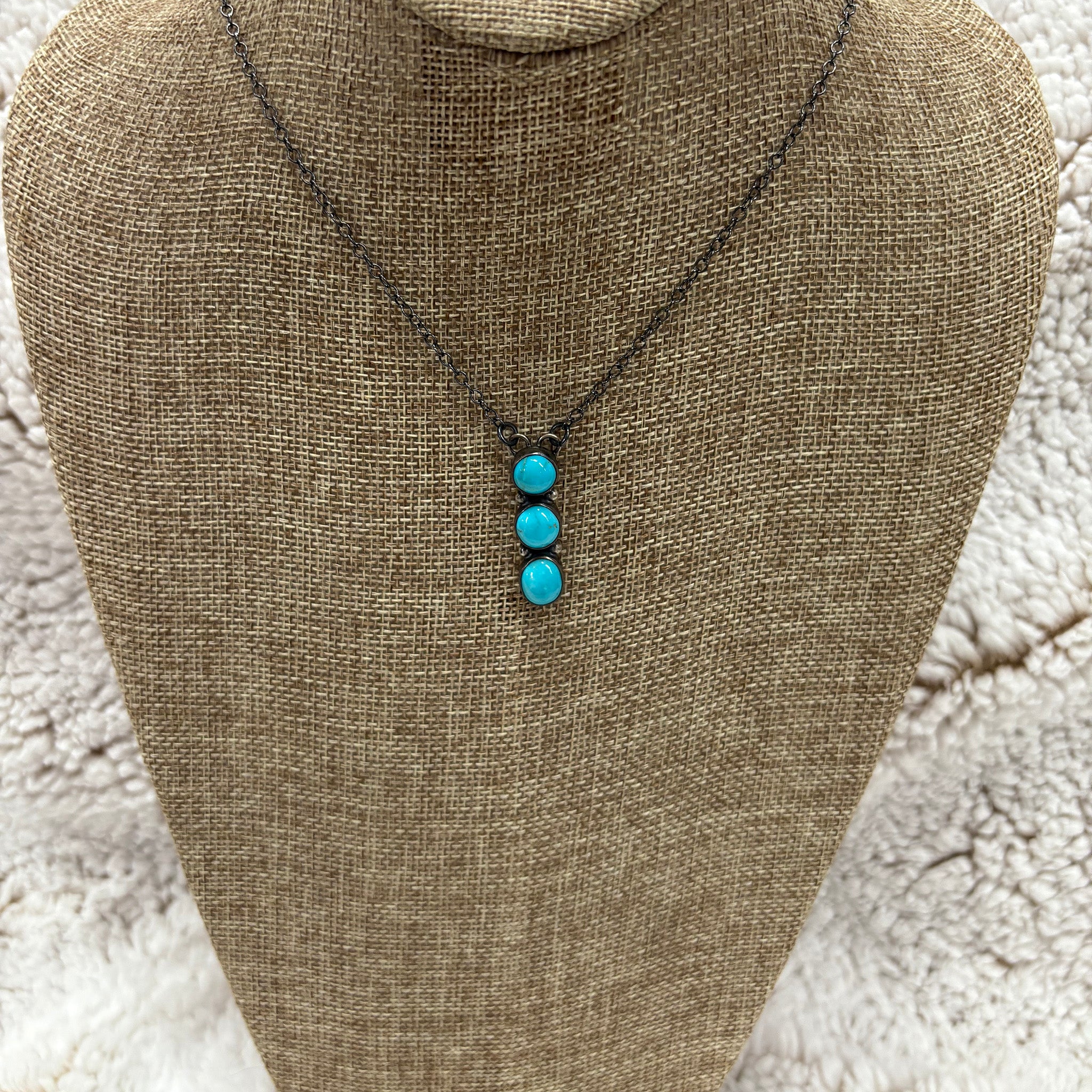The McKinley necklace showcases three striking Kingman turquoise stones set in sterling silver, each piece selected for its distinctive character and natural beauty. Kingman turquoise, sourced from Arizona's historic mines, is prized for its rich blue-green hues and authentic matrix patterns. This refined design balances elegance with artisanal craftsmanship, making it a versatile addition to both everyday wear and special occasions. The three-stone composition creates visual interest while maintaining a sophisticated, understated aesthetic that complements any wardrobe.