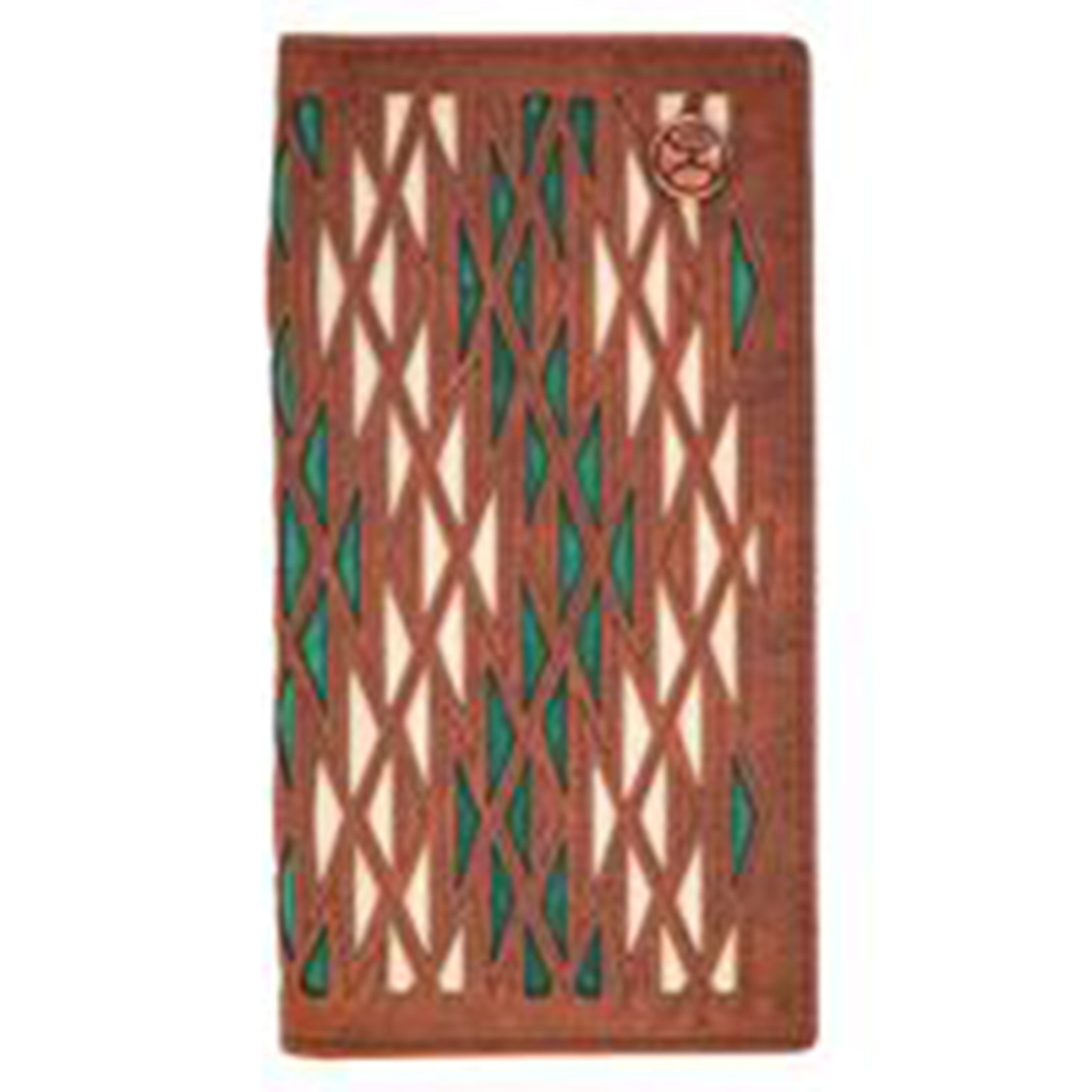 This genuine leather rodeo wallet has a laser cut Aztec design with a turquoise and ivory inlay. The corner is accented with a Hooey rivet, the back cover features the Hooey logo and inside the wallet is a turquoise accent so you know where the cash slot is.