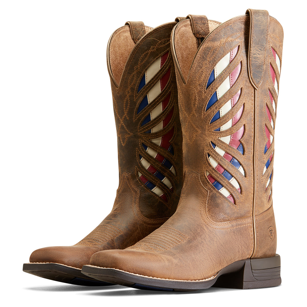 Experience the perfect blend of comfort and style with the Ariat women's Longview boots. These leather boots feature a striking red, white, and blue underlay design that adds a touch of flair to your outfit. With Ariat's expert craftsmanship, these boots offer durability and comfort for all-day wear.