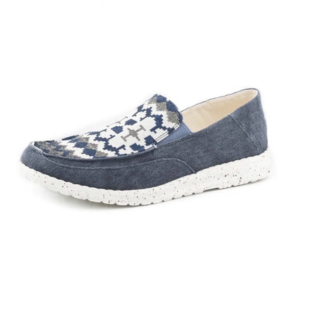The Roper Women's Navy Aztec Canvas Slip On shoes feature a flexible design that promotes foot health and offers all-day comfort. Lightweight and memory foam cushioned, they are durable enough for daily wear. Made in the USA, these versatile shoes complement any look or event.