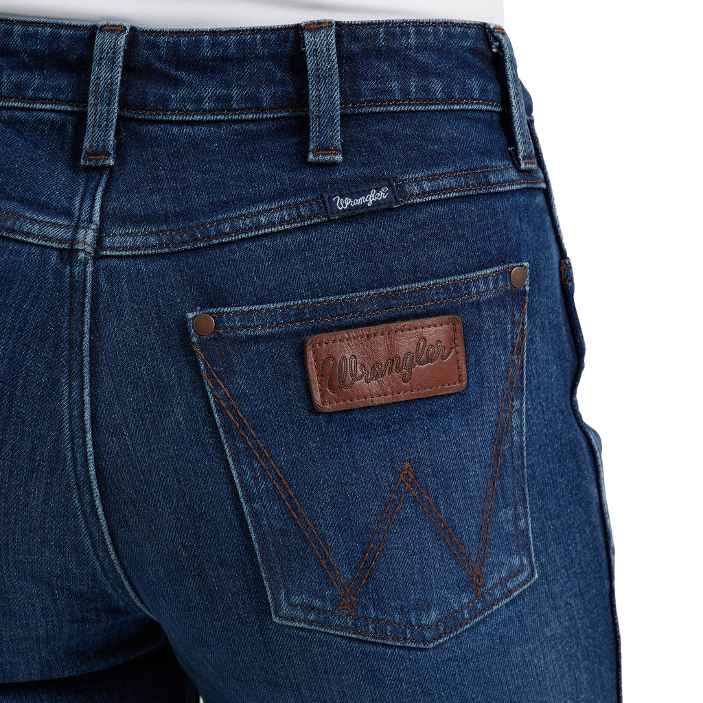 While trends may ebb and flow, the bootcut remains a timeless classic. Our Wrangler Women's Retro Bailey High Rise Bootcut Jean boasts a slimming waistline, a snug fit through the thigh, and a flared 17" leg opening that pairs flawlessly with boots. Made from a hint of stretch for comfort, these jeans feature the iconic five-pocket design, signature "W" stitching, and rope logo patch for that quintessential Western charm.
