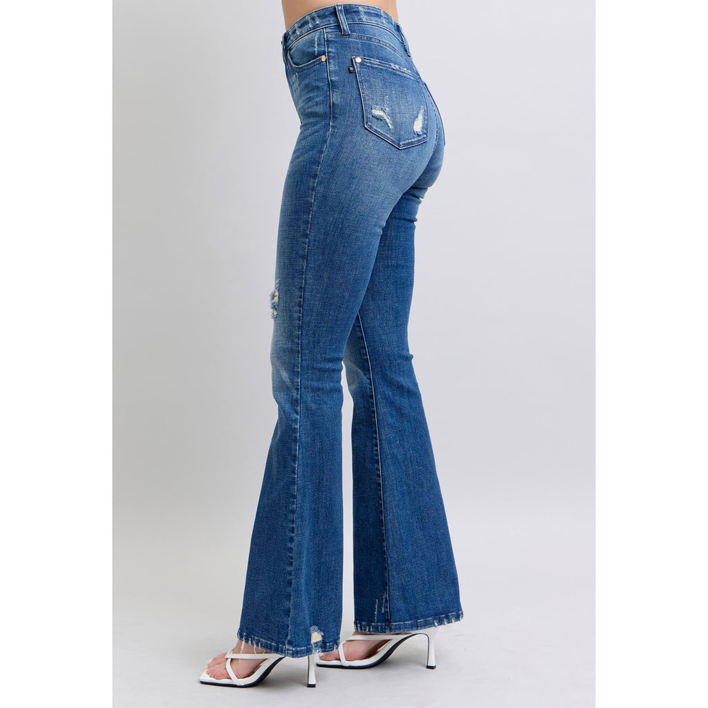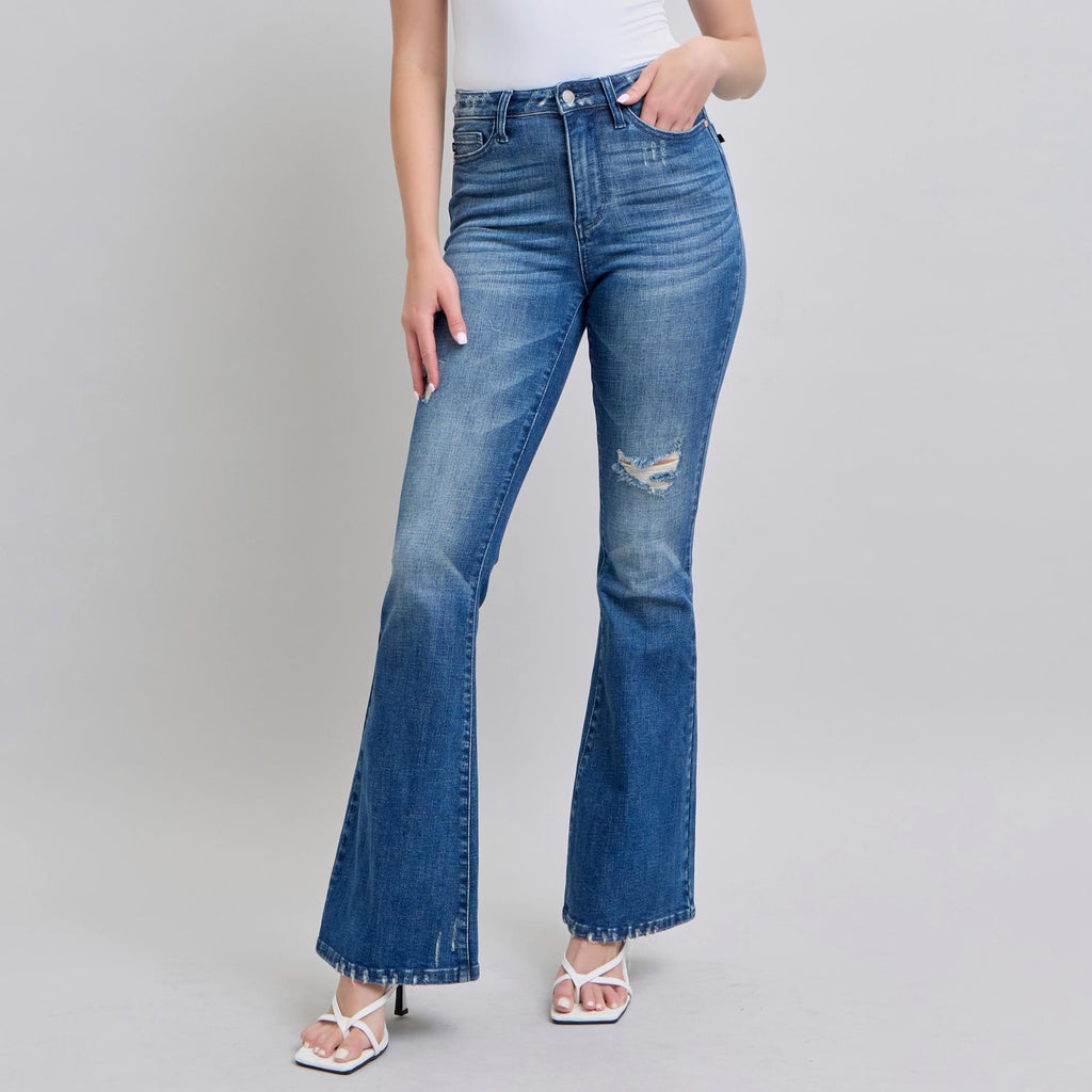 Elevate your style with Judy Blue women's contrast destroy flare jeans. The contrast wash design and destroyed details add edgy flair to these versatile jeans. Made with Judy Blue's signature comfort and durability, these jeans are a must-have for any fashion-forward woman.