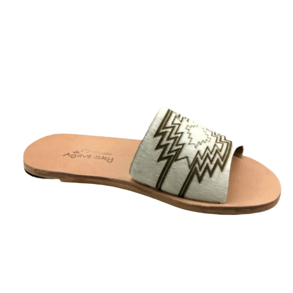 Elevate your wardrobe with the Agave Sky Women's Nadia White Hide Aztec Slide. Crafted with refined white hide and featuring an elegant Aztec design, these slides blend timeless style with subtle cultural artistry. Designed for effortless wear, they provide both comfort and sophistication, making them an ideal choice for those who appreciate understated luxury in their everyday footwear.