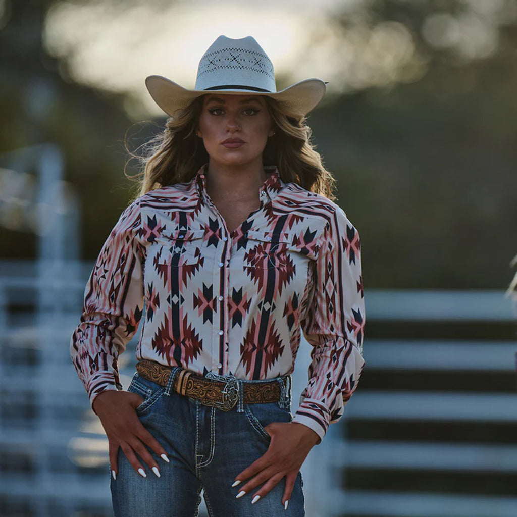 Make a bold entrance with the Hooey Ladies SOL White Long Sleeve Pearl Snap Shirt, showcasing vivid blue and pink Aztec patterns. This fearless design pairs bright colors with a comfortable fit, ideal for turning heads wherever you roam. Let your adventurous side shine and express your unique style with this standout long sleeve shirt.