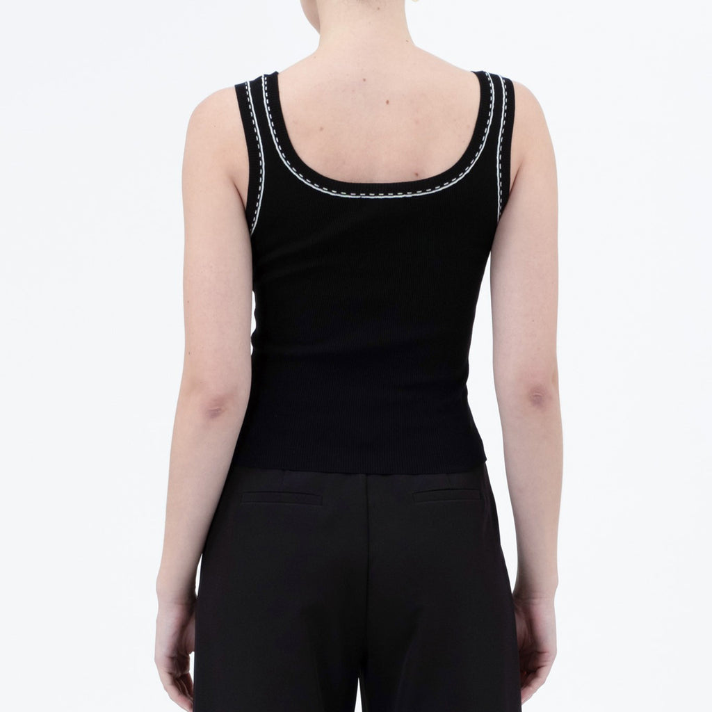 Say hello to your new summer staple! Our black line stitch knit tank features a sleek black design with unique stitch detailing, perfect for adding a touch of style to any outfit. Lightweight and comfortable, this tank is sure to keep you cool and looking effortlessly chic all season long.