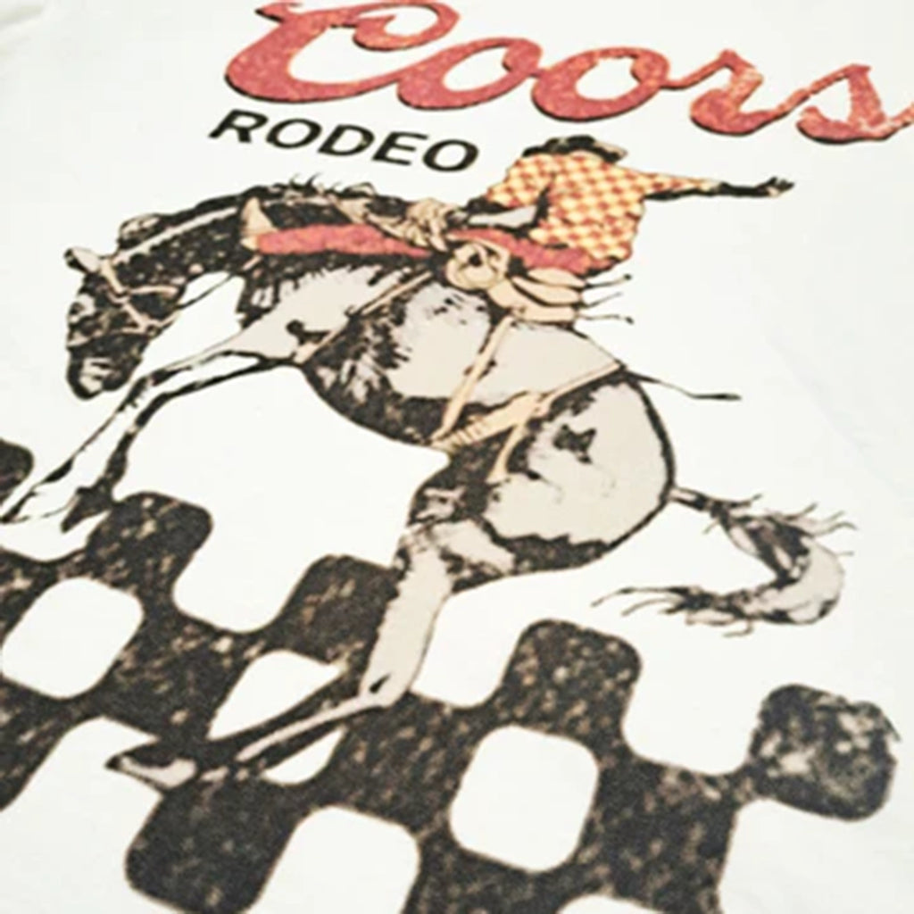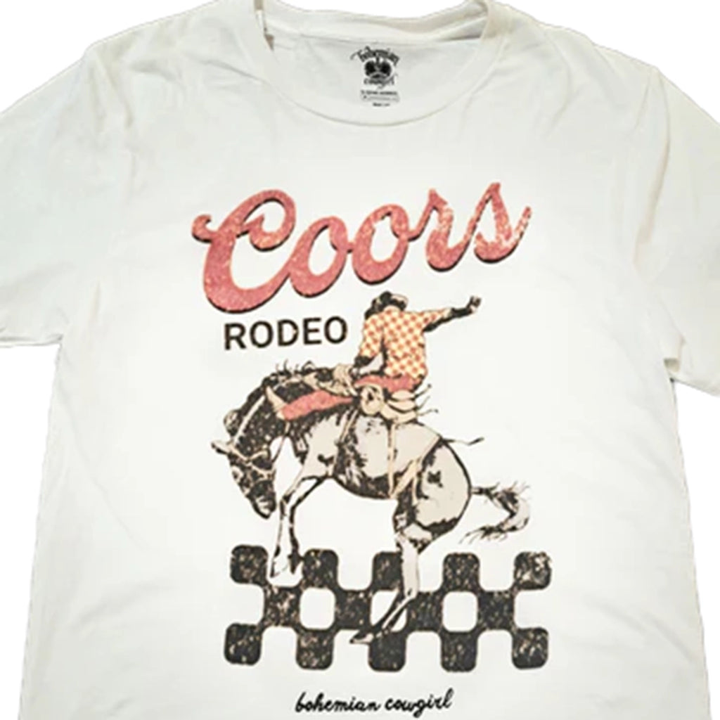 Embrace your western spirit with the Bohemian Cowgirl Coors Rodeo Checkered Bronc Tee. This tee features checkered accents and a classic bronco buster. Fit for comfort, this cream t-shirt brings all the vintage cowboy vibes.