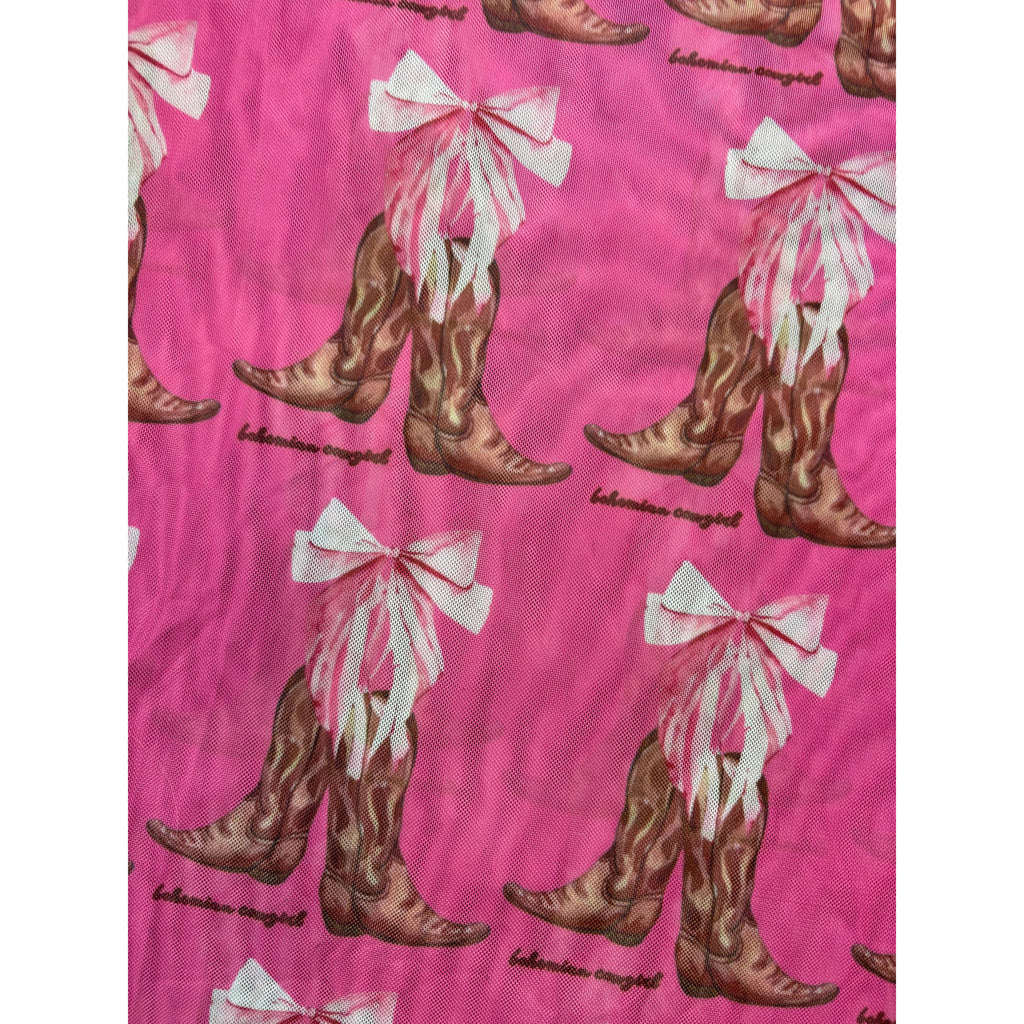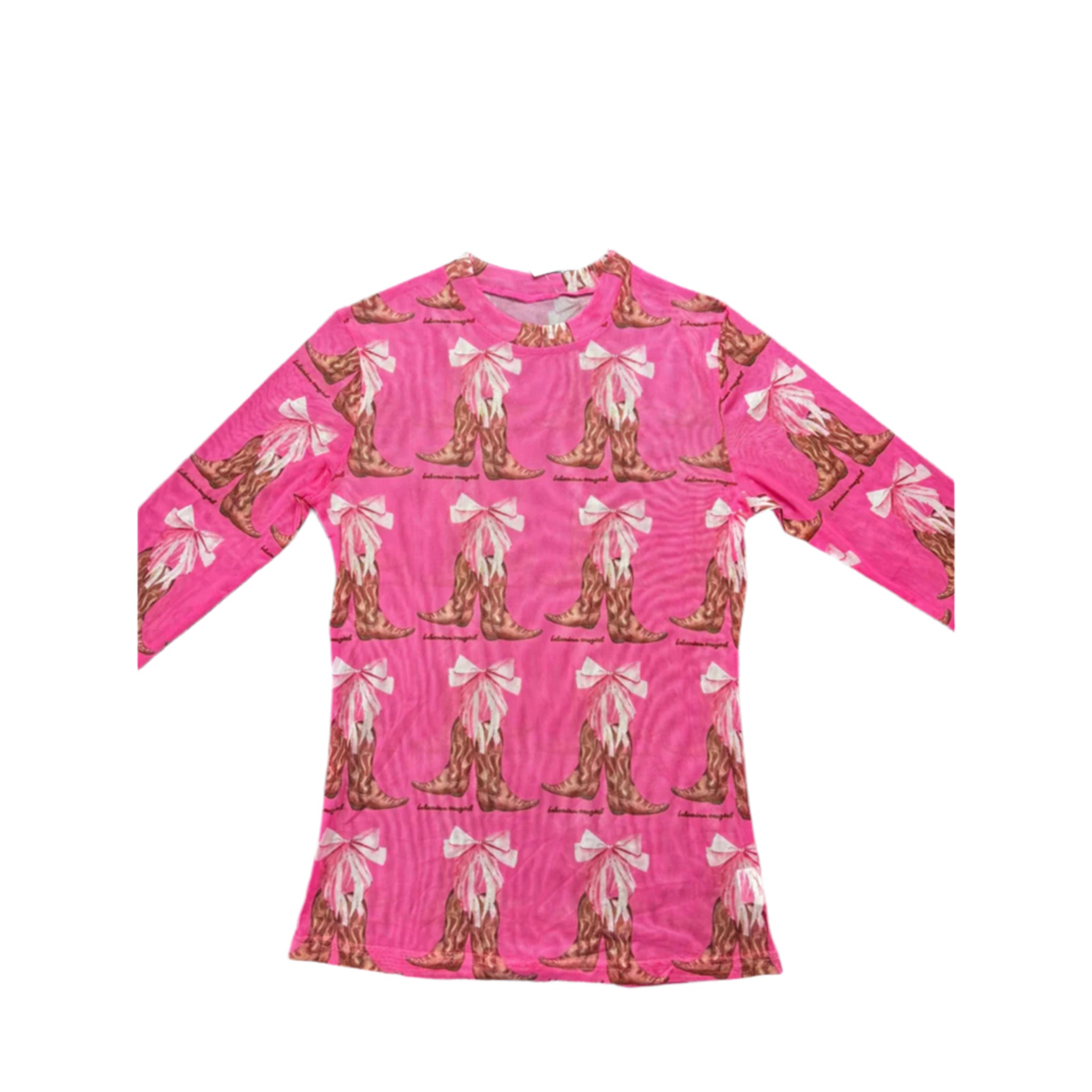 Embrace your playful spirit with this Bohemian Cowgirl long sleeve top, featuring charming pink bows and boots printed on breathable mesh fabric. Perfect for adding a flirty, western-inspired touch to your wardrobe while staying cool and comfortable all day long.