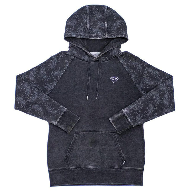 The shoulders, sleeves and outside of the hood are made of a muted paisley pattern over a vintage washed black fabric. The body is a solid vintage washed black fabric. Made with Hooey's Signature Soft Feel fabric and a soft double hood! Reinforced where needed for long wear. Rope Like A Girl logo on left front chest. The pictures don't do this one justice!