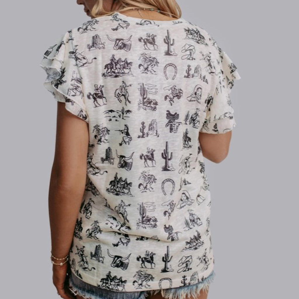 Unleash your inner cowgirl with this Western-inspired ruffled short sleeve. Combining a classic white and tan color Western scheme with playful ruffled sleeves, this top is perfect for a day out on the range or a night out on the town. Yee-haw!