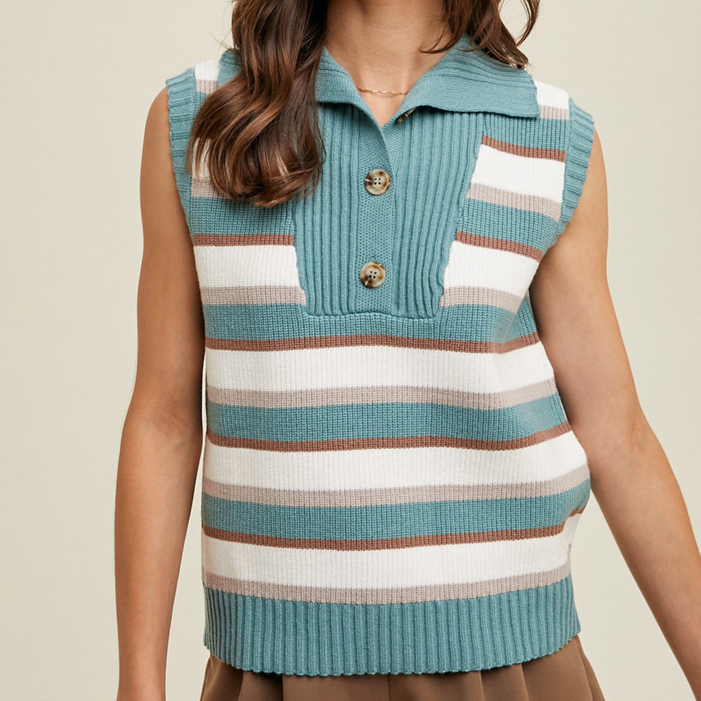 Conquer the fashion frontier with our women's teal & white stripe sweater vest! Stand out from the crowd with this bold and adventurous vest, featuring a striking teal and white stripe design. Perfect for those who love to take risks and make a statement. Add it to your wardrobe and elevate your style game!