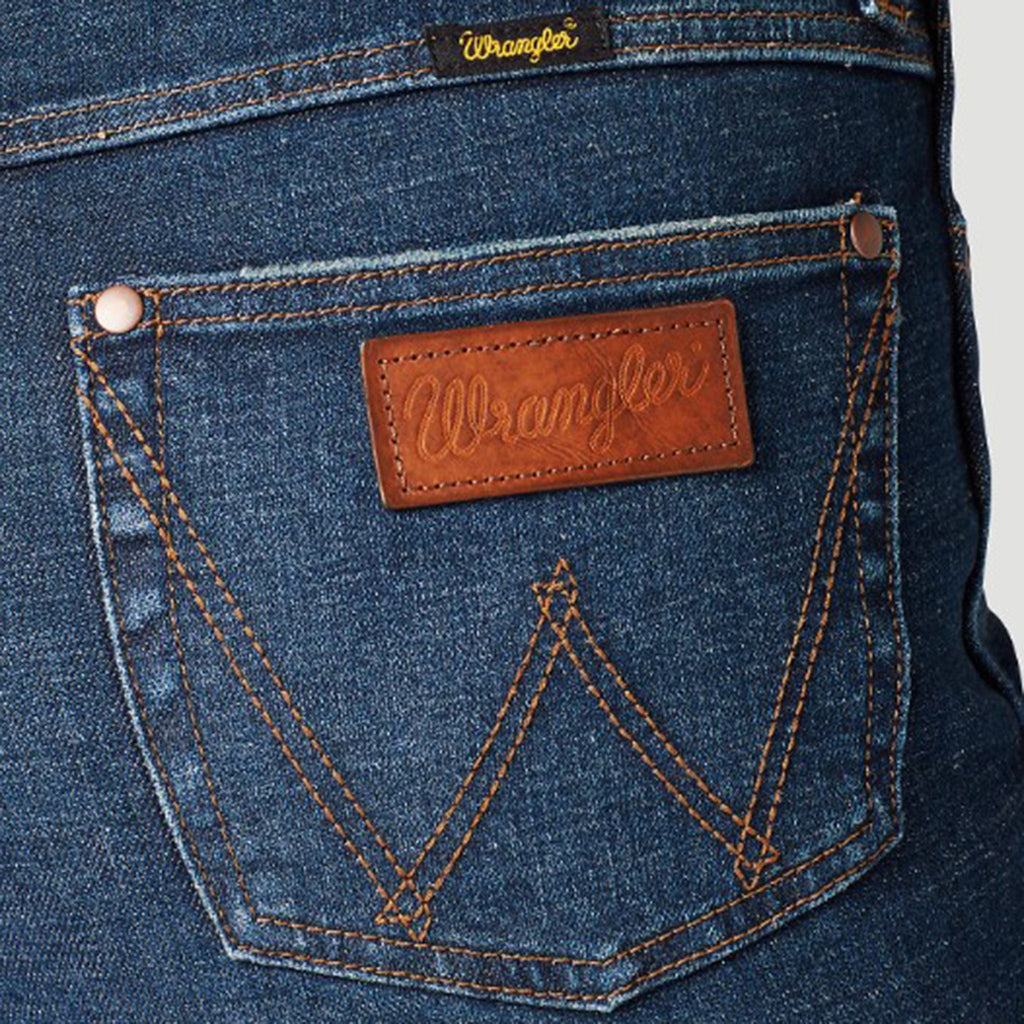 Traditional 5-pocket styling with classic Wrangler 'W' on back pockets. Zipper fly with button front closure. This style offers a close fit through the thigh before releasing at the knee to a subtle, wide-leg opening that fits perfectly around your favorite cowgirl boots and Western-inspired heels.