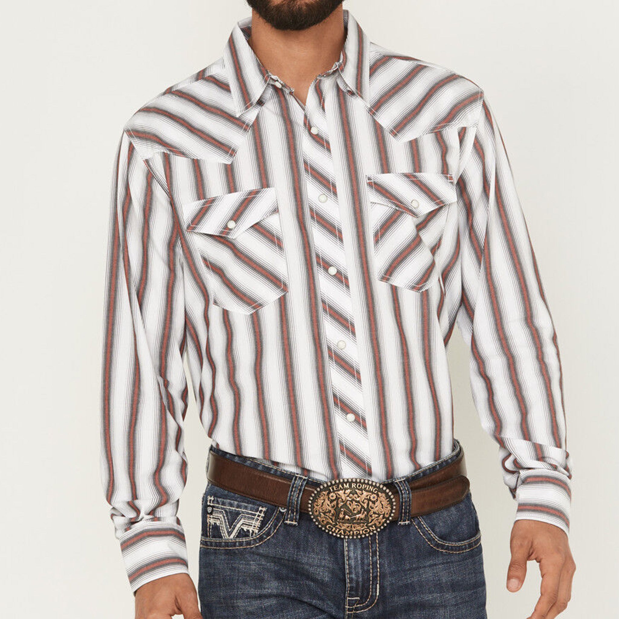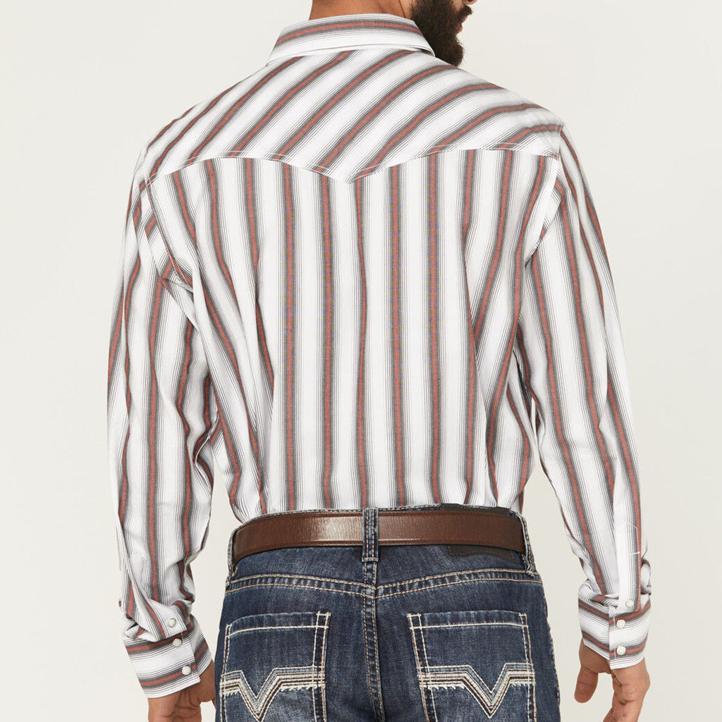 Wrangler 20x Red White and Grey Striped Print Long Sleeve Pearl Snap