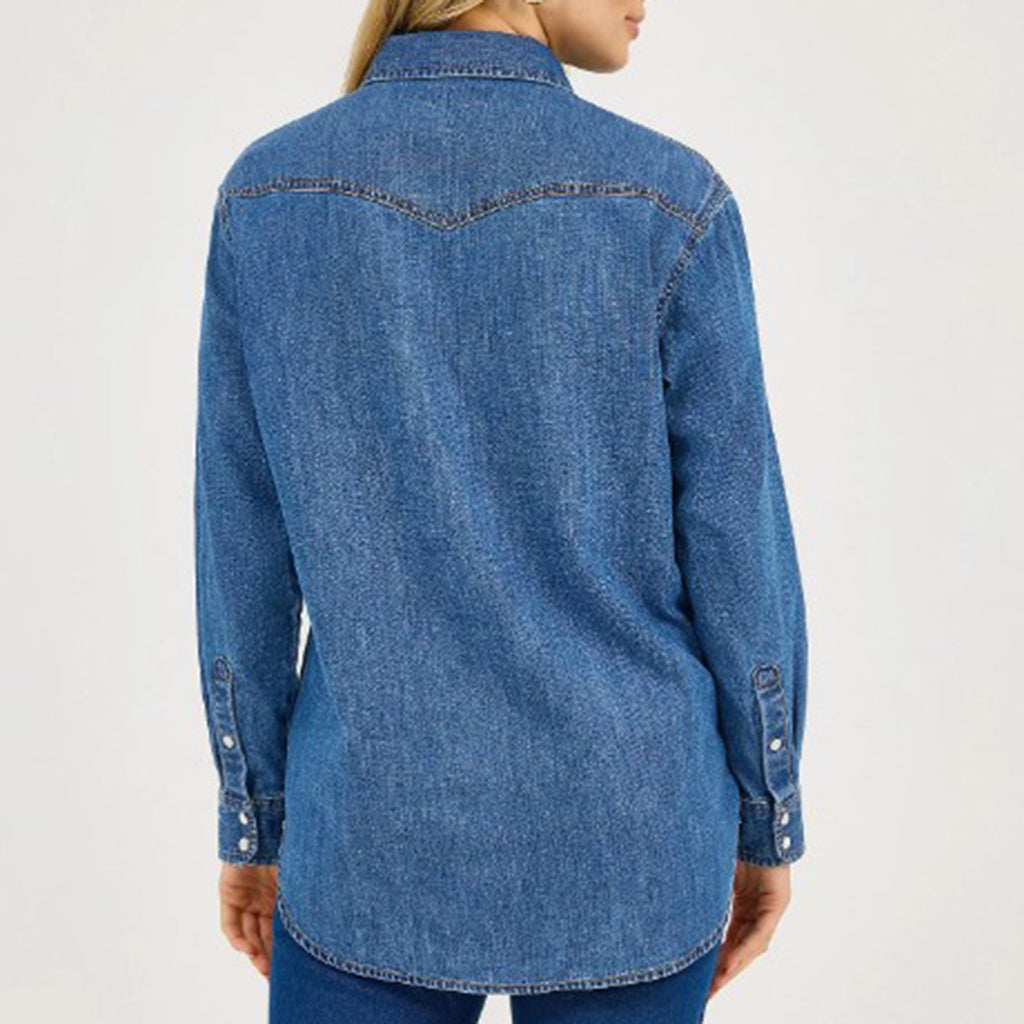 Saddle up in authentic Western style with this classic Wrangler denim button-up featuring a striking bronc pattern. Crafted from durable denim, this shirt delivers the rugged quality Wrangler is known for, perfect for ranch work or casual wear. The eye-catching bronc design adds character and personality to your wardrobe.