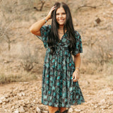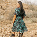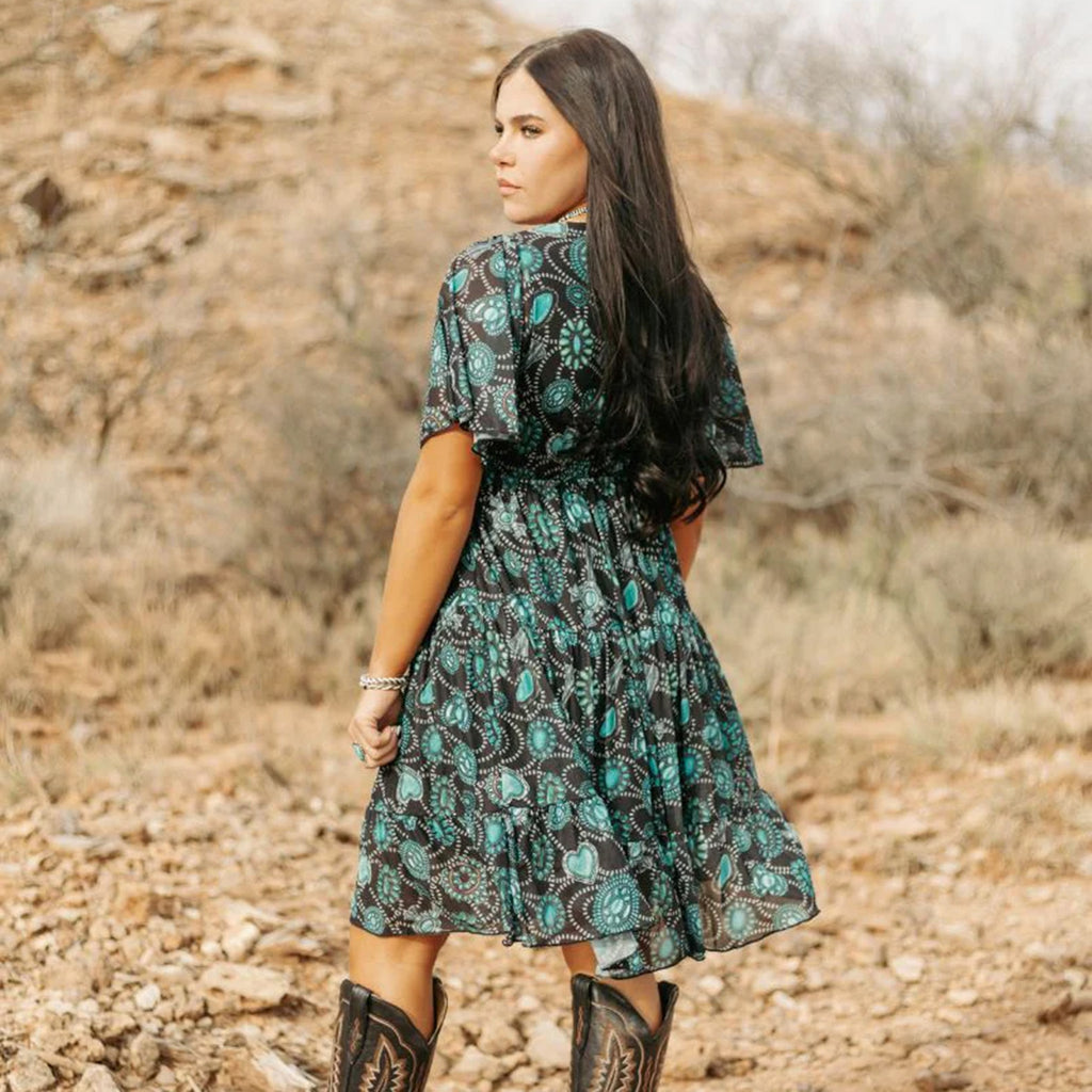 Rock your style with this beautiful dress! Bright turquoise conchos pop against the classic black fabric, creating a lively and eye-catching look. This dress brings a playful twist to traditional Navajo style, perfect for turning heads and sparking smiles wherever you go.