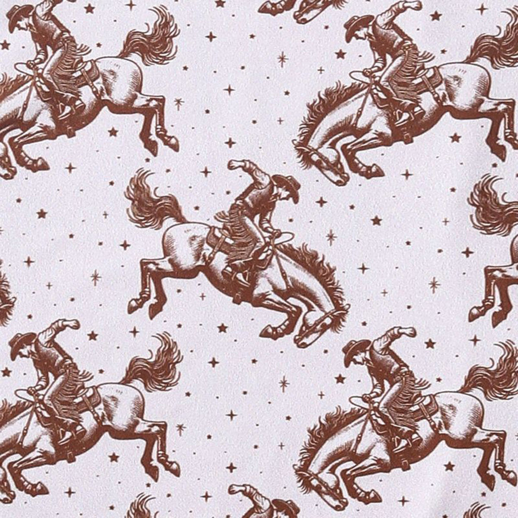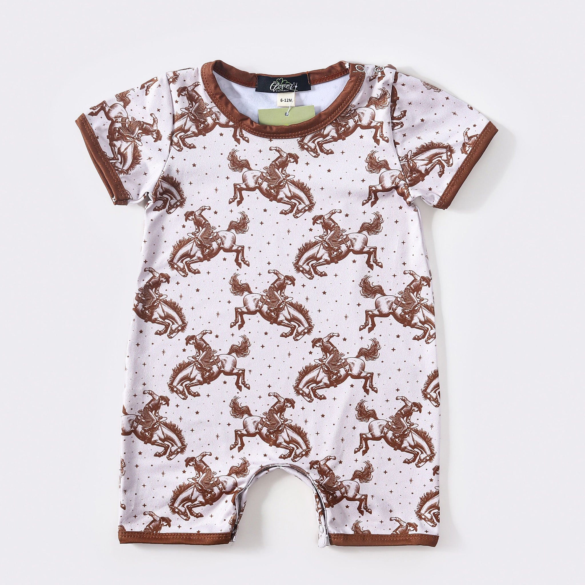 Get ready to gallop through the day with this Brown Bucking Boy Romper! Made from soft, durable fabric, this romper features a playful bucking horse design that is perfect for your little one. Whether they're crawling, walking, or just being adorable, they'll look stylish and comfortable in this romper. Giddy up!