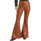 These pants designed by Rock & Roll look just like leather, but without the cost of real leather. Brown Pleather comes with extra stretch, a high rise and flare leg. Button closure.