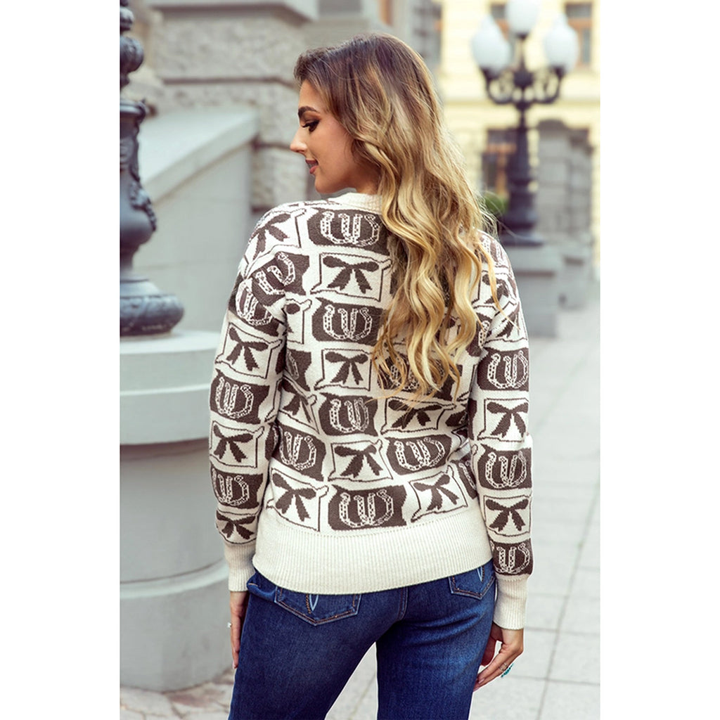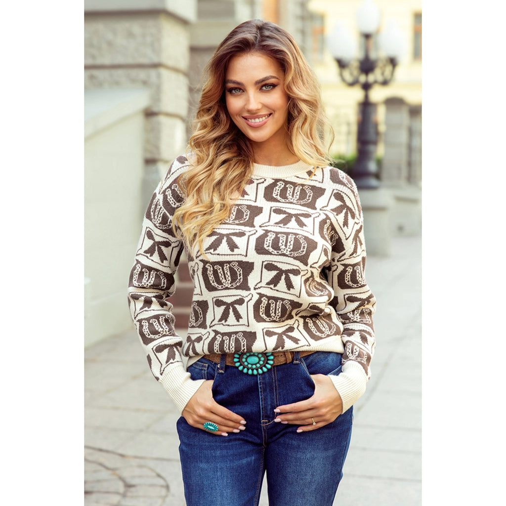 This charming sweater blends Western flair with timeless style, featuring a cream base adorned with brown horseshoe and bow motifs. Perfect for adding personality to your everyday wardrobe, it captures that effortless ranch-inspired aesthetic without sacrificing comfort.