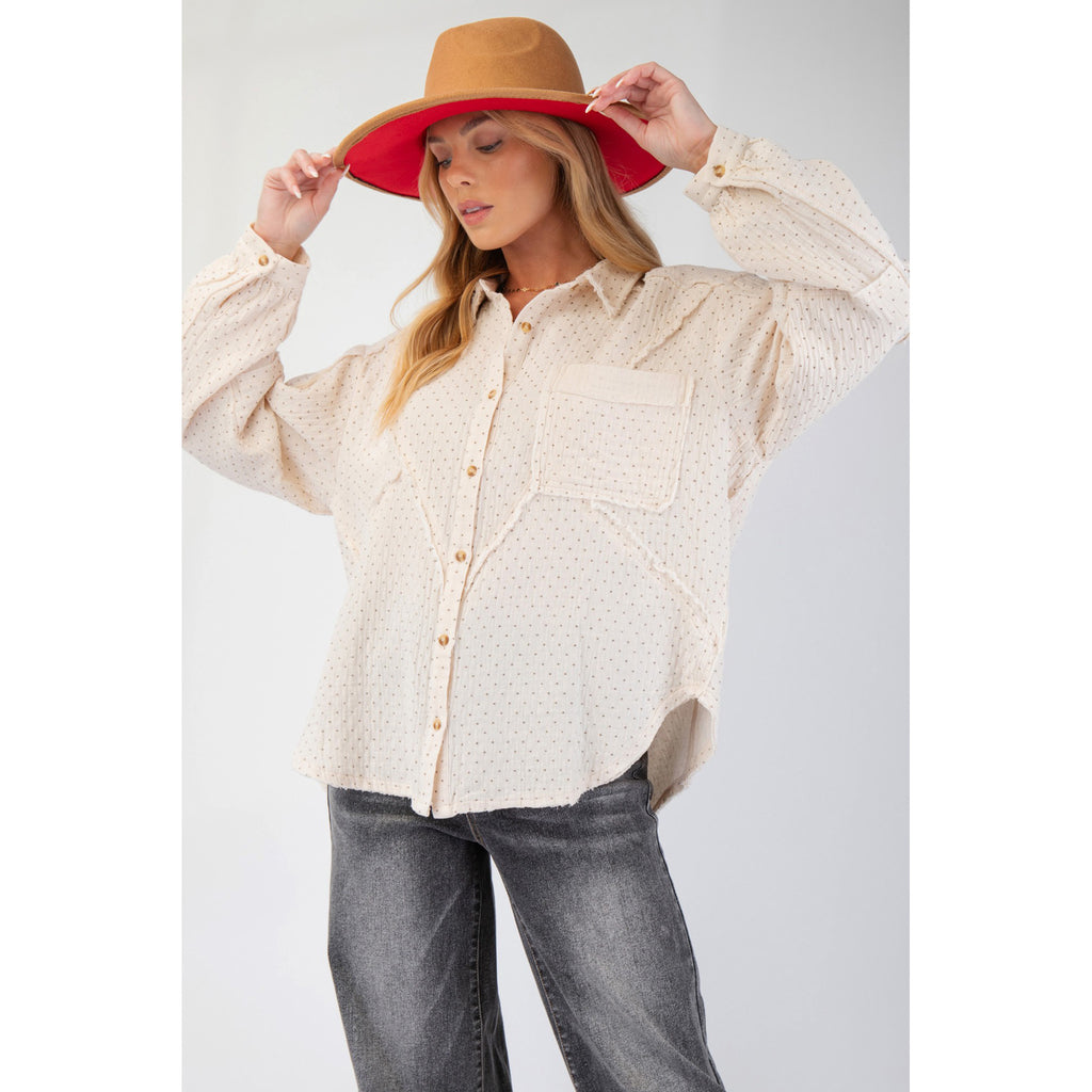 Indulge in effortless style with the Cream Printed Button Down Shirt. The woven cream mini polka dot print adds a touch of playfulness to the relaxed loose fit. Dropped shoulders and raw cut frayed seams create a casual and unique look, while the collared neck and button down front provide a classic touch. With a round hem, button cuffs, and front chest pocket, this shirt is both stylish and functional. Elevate your wardrobe today!