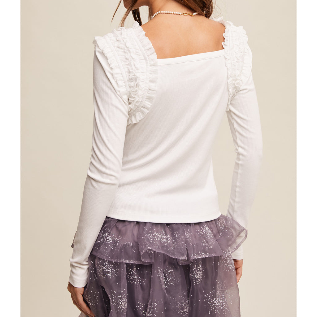 This top features a classic square neckline, elegant, ruffled shoulder accents, and long sleeves for a chic and versatile look. Made with high-quality materials, this top offers both style and comfort. Upgrade your wardrobe with this must-have piece today.