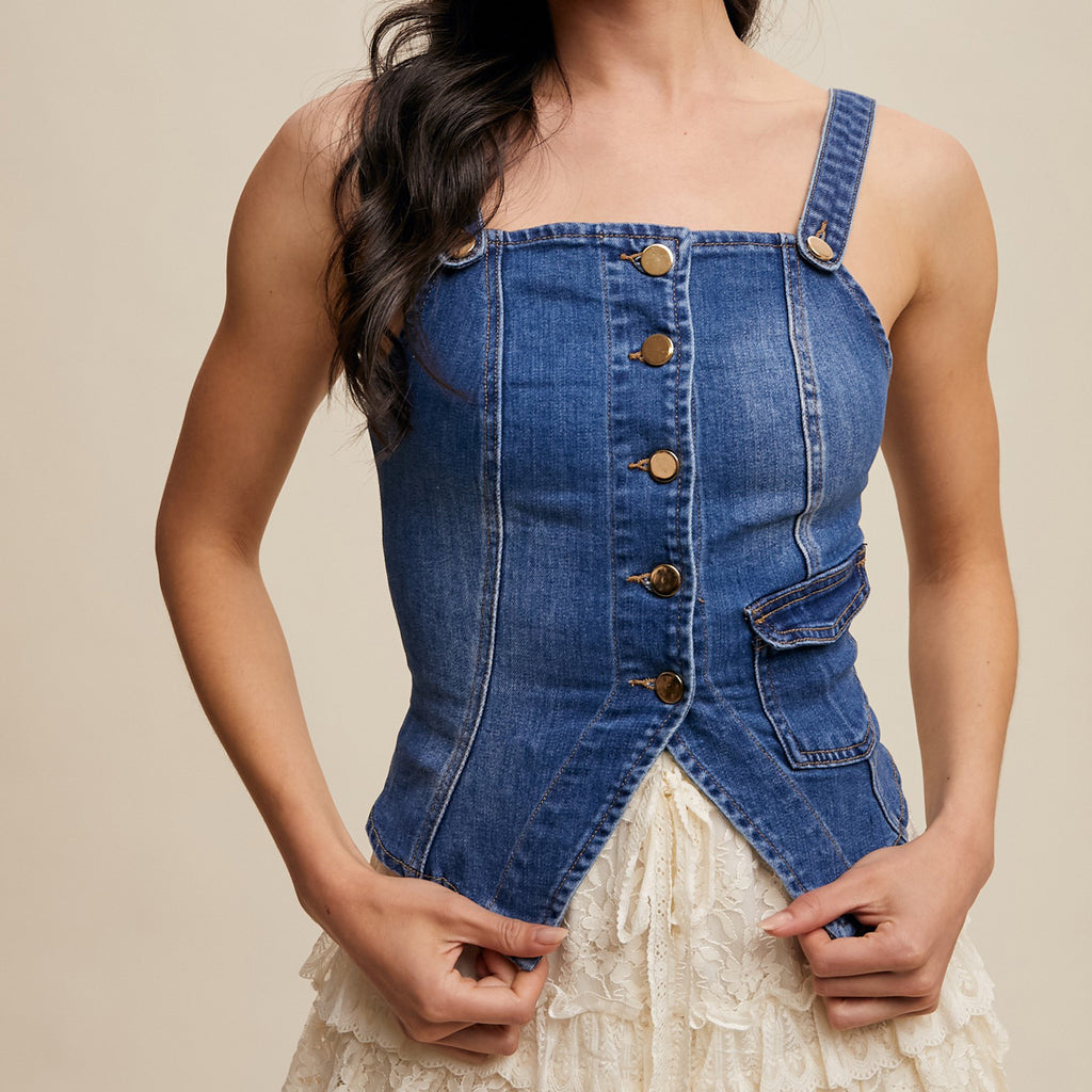 Transform your style with our Women's denim button up corset vest tank. This versatile piece can be dressed up or down, giving you the freedom to express your unique personality. With its button up design and corset-inspired details, you'll turn heads and feel confident all day long.