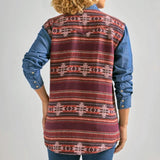 In rich autumn hues, the women's Wrangler retro woven back boyfriend denim western snap shirt will help your outfits pop. It features a slightly looser fit for a lived-in feel right from the start. This classic collared shirt comes with pointed yokes, pearl snaps, two chest pockets, a jacquard back, and jacquard-lined pocket flaps with a southwestern-inspired look.